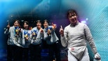 [한국45:43프랑스(펜싱여자사브르단체전결승·2025라인-루르하계유니버시아드)]44대43,승리까지딱한점이필요한상황.전하영선수의공격이이렇게먼저들어갑니다.유니버시아드,펜싱여자사브르단체전의금빛찌르기,우승세리머니도금메달감이네요.