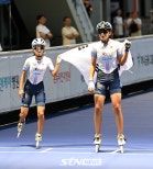 23일제천롤러스포츠경기장에서치러진'제20회아시아롤러스케이팅선수권대회'스피드트랙남자시니어5,000m포인트결선에서금메달을차지한정병희(충북체육회)가질주를펼치고있다./사진(제천)=김종원기자'스포츠도시'라불리는충청북도제천시에서44억명아시아인롤러축제가시작된다.제20회아시아롤러스케이팅선수권대회가오는19일부터30일까지총12일간열전에돌입한다.개최국한국을포함해총19개국1천800여명이경쟁을펼친다.주관방송사STN뉴스는대회기간동안현장에서생생한아시아선수들의롤러스케이팅열정을전달한다.[편집자주][STN뉴스=제천]이형주기자|한국이저력을보여줬다. 한국은23일제천롤러스포츠경기장에서치러진'제20회아시아롤러스케이팅선수권대회'스피드트랙남,여시니어5,000m포인트결선에서각각선전했다. 스피드트랙5,000m포인트는단순히최종결승선에서순위가메달로연결되는종목이아니다.마지막바퀴1위,2위,3위는각각3점,2점1점을부여한다.사전에공지되는포인트바퀴가있는데,포인트바퀴에서결승선을통과한1위,2위선수에게각각2점,1점을준다.빠른속도는물론 전략전술도필요하다고볼수있다.남자부결선에한국선수단은 정병희(충북체육회),방조양(은평구청)이출격했다.두선수가경기에임하는전략은달랐다. 정병희의경우초반부터선두권에위치했다.포인트바퀴에서영민한움직임을가져가며,점수를쌓았다. 방조양의전략은반대였다.선두권에위치했다.중반이후잠시주춤했지만,미친체력을앞세워막판스퍼트를벌였고4위로결승선을통과했다. 정병희는7분8초464의기록을작성했고,포인트16점을획득하면서최종순위1위로금메달을획득했다.방조양은7분4초773에,포인트13점을땄다.4위를기록하며아쉽게메달은획득하지못했다. 여자부는유가람(안양시청),나영서(은평구청)가결선서레이스를펼쳤다.유가람과나영서는초반부터선두권을차지하고유지하면서안정적인레이스를펼쳤다.신페이유(차이니즈타이페이)와리루위-흐수안(차이니즈타이페이)도유가람그리고나영서와경쟁했다. 두선수는선전했지만뒷심에서밀렸다.1위는7분39초005의기록에26포인트를쌓은신페이유에게돌아갔다.리루위-흐수안이7분40초08의기록에24포인트를쌓으며2위를차지했다. 유가람은7분41초950의기록으로결승선을통과했다.포인트는17점이었다.결과는3위였다.나영서는7분42초090의기록에2포인트를쌓아4위로레이스를마쳤다.23일제천롤러스포츠경기장에서치러진'제20회아시아롤러스케이팅선수권대회'스피드트랙여자시니어5,000m포인트결선에서유가람(안양시청)과나영서(은평구청)이트랙을달리고있다./사진(제천)=김종원기자STN뉴스=이형주기자