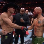 디에고로페스가‘파이팅너드’의마지막자존심제앙실바를무너뜨렸다.로페스는14일(이하한국시각)미국텍사스주샌안토니오의프로스트뱅크센터에서열린실바와의노체UFC메인이벤트페더급매치에서2라운드TKO승리했다.로페스는지난알렉산더볼카노프스키와의페더급타이틀전에서패배,아쉬움을남겼다.그러나그는가장강력한도전자였던실바를잡아내며다시한번도전할수있는명분을얻어냈다.사진=ESPNSNS환상적인스피닝백엘보우가경기를끝냈다.로페스는2라운드부터살아난실바의타격에큰위기를맞았으나순간시도한스피닝백엘보우로역전승리했다.실바는‘파이팅너드’의마지막자존심이었다.최근카이오보할류,마우리시우루피,카를로스프라치스등의무패행진을끊기면서단하나남은무패파이터였던것.하나,로페스의벽을넘지못하면서그역시1패를안게됐다.1라운드초반은탐색전이었다.로페스와실바모두킥공격을주고받았다.이때로페스가기습테이크다운,상위포지션을가져가면서시리바를압박했다.이후수직엘보우폭격이이어지면서실바의얼굴을붉게물들었다.실바는다시일어섰으나로페스에게내준흐름을찾아오지못했다.로페스는1라운드종료직전,프론트킥을허용했으나큰문제는아니었다.2라운드는혼란그자체였다.1라운드내내얻어맞기만한실바가로페스를타격전에서앞섰다.로페스는처음에는여유를보였으나계속타격을허용하면서미소를잃었다.로페스는실바의강력한오른손펀치를연달아허용했다.이후타격전을펼쳤으나반응속도가느려지면서오히려밀리고말았다.이때로페스가실바의뒤를잡았다.이후다시한번그라운드로끌고가는듯했으나실바가다시일어서며위기를맞았다.로페스는단한번의기회를놓치지않았다.실바가자신의전장인타격전을펼치며몰아붙이자기습적인스피닝백엘보우로무너뜨렸다.이어진마무리에경기는그대로끝났다.[민준구MK스포츠기자]