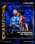 ▲월드테이블테니스(WTT)스타컨텐더류블랴나대회에서세계1위르브렁형제를꺾은임종훈-안재현남자복식조ⓒWTT홈페이지[스포티비뉴스=조용운기자]한국남자탁구간판조합인임종훈-안재현(이상한국거래소)이세계랭킹1위를꺾고올시즌두번째정상에올랐다.더불어조합을완성하고세번째합작한우승이다.남자복식세계10위의임종훈-안재현조는22일(한국시간)슬로베니아류블랴나에서열린월드테이블테이스(WTT)스타컨텐더남자복식결승에서프랑스의펠릭스르브렁-알렉시르브렁형제조를3-0(11-9,11-9,12-10)으로완파하고우승을달성했다.지난3월인도첸나이에서열렸던스타컨텐더대회를제패했던임종훈-안재현조는올해만두차례복식우승컵을들어올리며정상급경쟁력을과시하고있다.최근한국탁구는다양한복식조를조합하고있다.내년아시안게임을위한준비가운데임종훈-안재현조는상당한성공기를써가고있다.지난해10월에는아스타나아시아선수권대회에서한국선수로는32년만에우승한바있다.복식조중심인임종훈은지난16일북마케도니아스코페에서끝난컨텐더대회에서는오준성(한국거래소)과호흡을맞춰우승했다.이보다한단계높은스타컨텐더에서안재현과다시조를이뤄정상에오르면서아시안게임금메달을향해순항했다.▲월드테이블테니스(WTT)스타컨텐더류블랴나대회에서세계1위르브렁형제를꺾은임종훈-안재현남자복식조ⓒWTT홈페이지임종훈과안재현은4강에서홍콩간판웡춘팅-챈볼드윈조를풀게임끝에3-2로따돌렸다.결승에서는세계랭킹1위를따돌렸다.프랑스국가대표로활약하는르브렁형제를맞아매게임땀을쥐는명승부를펼친끝에완파했다.형제들의호흡을넘어서는공수균형이해답이었다.수비가좋은임종훈과오른손공격이강한안재현의플레이가시너지를내면서난적을따돌렸다.1세트를역전승으로가져온임종훈-안재현은2세트도승리를챙긴뒤듀스싸움까지간3세트마저챙겨우승의기쁨을누렸다.임종훈은여자대표팀에이스신유빈(대한항공)과손발을맞춘혼합복식에서도우승을노린다.임종훈-신유빈조는결승에서브라질의우고칼데라노-브루노다카하시조를상대한다.