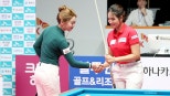 ▲2022-2023시즌월드챔피언십결승에서만났던김가영-스롱피아비 '캄보디아특급'스롱피아비(우리금융캐피탈)와'당구여제'김가영(하나카드)이다시한번맞붙습니다. 스롱은어제경기도고양킨텍스PBA스타디움에서열린프로당구2025-2026시즌2차투어'하나카드PBA-LPBA챔피언십'LPBA8강전에서김상아(하림)를세트스코어3대0으로꺾고4강에진출했습니다. 김가영도강지은(SK렌터카)을3대1로제압하며준결승에올랐습니다. 스롱은1세트에서하이런8점을앞세워11대3으로기선을제압한뒤,2세트(11대8·7이닝)와3세트(11대2·9이닝)도차례로가져가며완승을따냈습니다. 한편,김가영은1세트를2대11로내줬지만,이후세세트를연달아따내며역전승을거뒀습니다. 김가영과스롱의맞대결은지난시즌월드챔피언십4강이후두대회만입니다. LPBA통산최다우승자김가영(15회)과그뒤를잇는스롱(7회)은리그대표라이벌입니다. 김가영은최근스롱과의3경기에서모두승리했으며,2024-2025시즌들어8연속우승을달성하며독주체제를굳히고있습니다. 스롱이김가영을상대로마지막으로승리한건2022-2023시즌월드챔피언십결승전입니다. 또다른LPBA4강에선김보라와최지민이맞붙습니다. 김보라는히다오리에(일본·SK렌터카)를3대0으로꺾고LPBA데뷔이후첫4강에진출했고,최지민은김민영(우리금융캐피탈)을3대1로제압했습니다. 이날열린PBA32강에서는조재호(NH농협카드),강동궁(SK렌터카),김준태(하림),다비드마르티네스(스페인·크라운해태)등주요선수들이16강에안착했습니다. 5일에는LPBA준결승전과PBA16강전이진행됩니다. (사진=PBA제공,연합뉴스)