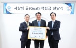 신수진(왼쪽)HL안양단장과최대호(가운데)안양시장이‘사랑의골펀드’적립금5000만원을전달한뒤기념촬영을하고있다.HL안양제공HL안양아이스하키단이22일‘사랑의골펀드’적립금5000만원을안양시에전달했다.2016년에시작된‘사랑의골’펀드는HL그룹의대표사회공헌활동으로득점당적립금은20만원,통합우승일경우축하금이더해진다.지난5일HL안양은통산9번째챔피언트로피를들어올렸다.10주년을맞은이번사랑의골나눔기부금은안양시저소득취약계층에쓰인다.기부금전달식에는최대호안양시장,HL안양신수진단장,경기도사회복지공동모금회김효진사무처장등이참석했다.최대호안양시장은기부금전달식에서“10년간이어온HL그룹의변함없는나눔에감사드린다”라며“이번기부금은어려운이웃들에게큰힘이될것”이라고말했다.