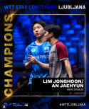 임종훈(왼쪽)-안재현이21일(한국시간)슬로베니아할라티볼리에서열린WTT스타컨텐더류블랴나대회5일째남자복식결승에서알렉시스르브런-펠릭스르브런을게임스코어3-0으로꺾고금메달을목에걸었다.지난달카타르도하에서열린2025세계선수권대회에서부진을씻어내며재도약의신호탄을쐈다.사진출처│WTT인스타그램탁구국가대표팀임종훈(28)-안재현(26·이상한국거래소·세계랭킹11위)이WTT스타컨텐더류블랴나대회남자복식에서우승했다.지난달카타르도하에서열린2025세계선수권대회에서부진을씻어내며재도약의신호탄을쐈다.임종훈-안재현은21일(한국시간)슬로베니아할라티볼리에서열린대회5일째남자복식결승에서알렉시스르브런-펠릭스르브런(프랑스·1위)을게임스코어3-0(11-911-912-10)으로꺾고금메달을목에걸었다.지난해10월카자스흐탄아스타나아시아선수권대회,올해3월WTT스타컨텐더첸나이대회에이어3번째로국제대회우승을합작했다.이번대회를앞두고임종훈-안재현의전망은밝지않았다.대전동산고시절부터호흡을맞췄지만,오랜기간남자복식에서이렇다할성적을내지못했기때문이다.지난달도하세계선수권대회에선32강에서당시세계26위였던모하메드엘베이알리-유세프압델라지즈(이집트·16위)에덜미를잡혔다.그러나이번대회는달랐다.백핸드드라이브가강점인왼손잡이임종훈,손감각과포핸드공격이뛰어난오른손잡이안재현의시너지가빛을발했다.16강부터준결승까지다르코요르지치-데니코줄(슬로베니아·52위),마르틴알레그로-아드리엔라젠포세(벨기에·42위·이상3-0승),웡춘팅-볼드윈챈(홍콩·15위·3-2승)를모두꺾었다.대회전“비중국조에겐절대지지않겠다”던이들의다짐은결승에서도통했다.세계1위‘르브런형제’를맞아25분19초만에승리를따냈다.르브런형제는약20년동안호흡을맞춘조합이지만임종훈-안재현을맞아힘을쓰지못했다.임종훈-안재현은1게임5-8에서상대범실로8-8동점을만들었다.10-9에서안재현의포핸드드라이브를펠릭스르브런이받아내지못해첫게임을따냈다.이후로는순조로웠다.임종훈이공격전략을포핸드위주로바꾸면서2게임까지따냈다.5-5에서잇달아2점을따낸이후단한번도동점을허용하지않았다.결국3게임10-10듀스에서임종훈의포핸드공격을알렉시스르브런과펠릭스르브런이잇달아받아내지못하며승부에마침표를찍었다.