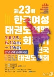 제23회한국여성태권도연맹회장기'전국태권도대회'포스터(구례=뉴스1)서순규기자=전남구례군은12일부터19일까지구례실내체육관에서제23회한국여성태권도연맹회장기'전국태권도대회'를개최한다.격파·품새·겨루기3개종목에서초등부부터일반부까지3500여명의선수가참가해기량을겨룬다.구례군은이대회가태권도저변확대와지역경제활성화에기여할것으로기대하고있다.김순호군수는"전국에서모인선수단과방문객을구례에서맞이하게돼매우뜻깊게생각한다"며"대회기간선수들이최상의컨디션에서경기를치를수있도록최선을다해지원하겠다"고말했다.