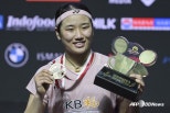 [스타뉴스|양정웅기자]안세영이8일열린인도네시아오픈여자단식우승후메달과트로피를들고기뻐하고있다./AFPBBNews=뉴스1'배드민턴황제'안세영(23·삼성생명)이지난대회의아픔을딛고역전우승을차지했다.세계랭킹1위안세영은8일인도네시아자카르타에서열린세계배드민턴연맹(BWF)월드투어슈퍼1000인도네시아오픈'여자단식결승전에서중국의왕즈이(세계랭킹2위)를2-1(13-2121-1921-15)로꺾었다.이로써이번대회우승을차지한안세영은올해5번째국제대회정상에올랐다.또한인도네시아오픈에서는2021년이후4년만에우승을따냈다.그는올해말레이시아오픈,인도오픈,오를레앙마스터스,전영오픈을연달아제패했지만,직전싱가포르오픈8강에서'천적'천위페이(중국)에게패해5연승이무산됐다.하지만다음대회에서곧바로정상복귀에성공했다.1게임에서안세영은몸이무거워보이는모습이었다.초반5-10까지격차가벌어졌고,이후연속4점을올려한점차까지만들었다.하지만10-11에서6점을내리내주며왕즈이를따라잡지못했다.결국1게임은13-21로내줬다.이어안세영은2게임에서도시작부터0-5로밀렸고,격차가좁혀질만하면벌어지면서한때9-17까지도밀렸다.하지만이때부터안세영의뒷심이발휘됐다.순식간에6연속득점을올리면서맹추격에나서더니결국19-18로게임을뒤집었다.이후우세를지켜내면서21-19로이기며승부를원점으로돌렸다.3게임에서는중반까지치열한승부가펼쳐졌다.하지만역시안세영을이겨낼수는없었다.9-9동점상황에서안세영이4연속득점으로도망가기시작하자승부는한쪽으로기울었다.막판실점이이어졌으나승부에는지장이없었다.뉴시스보도에따르면경기후안세영은"모든분이나를많이도와줘서항상발전할수있었다.최선을다해서내가해야하는것들을계속해왔다"며역전을일군비결에대해"그저나를믿었다"고밝혔다.안세영이8일열린인도네시아오픈여자단식결승전에나서고있다./AFPBBNews=뉴스1