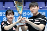 프로당구선수협회(회장황득희)가주최주관한‘프로-동호인스카치대회’에서우승한최혜미(웰컴저축은행)-남윤형조가트로피를들고기념촬영하고있다.(사진=PBA)27일프로당구선수협회장배스카치대회,결승서임태수-손부원조30:23제압,“상금1000만원은반으로나눠사용”‘찰떡호흡’을과시한최혜미(웰컴저축은행)와남윤형이프로선수와동호인이함께하는스카치당구대회서우승했다.최혜미(웰컴저축은행)-남윤형은27일경기도고양시고양킨텍스PBA스타디움에서열린‘프로당구선수협회장배전국프로선수&동호인스카치당구대회’결승전서임태수-손부원을30:23(35이닝)으로물리쳤다.상금은우승1000만원,준우승250만원(500만원상당M.PCues큐2자루)이다.임태수-손부원조는8강에서하이런16점을올리며하이런상도받았다.‘프로-동호인스카치대회’결승전에서맞붙은임태수-손부원조(왼쪽)와최혜미-남윤형조(오른쪽).(사진=PBA)4강에진출한유일한혼성팀인최혜미-남윤형은대회룰에따라4점을먼저안고시작,초반부터7:0으로앞서나간끝에35이닝만에30:23으로경기를마무리했다.최혜미-남윤형조는‘프로-동호인스카치대회’결승전에서찰떡호흡을과시하며승리했다.(사진=PBA)최혜미-남윤현은“한경기한경기이겨보자라는생각으로대회에임했는데우승까지해기쁘다.상금은반으로나눠서쓰겠다.의미있는대회를열어주어감사하다”고말했다.프로당구선수협회(회장황득희)가주최주관한이번대회는프로당구선수들과동호인이한팀이되어출전하는당구대회다.경기도체육회육성지원사업에선정되어개최됐고168개팀,336명이참가했다.[김기영MK빌리어드뉴스기자]