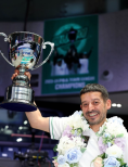 PBA통산2승째를거둔초클루/PBA제공튀르키예3쿠션스타무라트나지초클루(하나카드)가스페인의전설적선수다니엘산체스(웰컴저축은행)를물리치고프로당구2025시즌첫대회타이틀을거머쥐었다.초클루는23일오후고양시킨텍스PBA스타디움에서벌어진우리금융캐피탈PBA-LPBA챔피언십남자부결승에서산체스를세트스코어4-1(15-12,15-11,15-8,6-15,15-4)로제압하며개인통산두번째투어정상에올랐다.초클루가PBA투어에서우승컵을들어올리는것은2023-2024시즌9차전크라운해태챔피언십이후약1년3개월만의일이다.한편대회기간중단일경기최고애버리지를기록한선수에게수여하는'웰컴톱랭킹'특별상(상금200만원)은128강전에서윤순재를상대로3.462의애버리지를작성한황형범에게돌아갔다.초클루의당구인생은순탄치않았다.어려운집안사정으로중학교1학년때학업을포기하고생계전선에뛰어들어야했다.버스기사와택시운전사로일하면서도당구에대한열정을놓지않았던그는2004년유럽3쿠션선수권대회우승을통해비로소두각을나타내기시작했다.2023년한국프로무대에정착한초클루는빠른적응력을보여주며상위권선수로자리매김했다.특히PBA팀리그에서는소속팀하나카드의창단첫우승을이끌어내며포스트시즌MVP로선정되는등팀과개인모두에서성과를거뒀다.이번우승으로초클루는같은튀르키예출신선배인세미사이그너(웰컴저축은행)와동일한투어2승을기록하며PBA에서활약하는튀르키예선수들의위상을한층높였다.우승후초클루는"지난시즌월드챔피언십종료후당구큐를고국에가져가지않았다.가족과의시간,일상의행복에온전히집중하고싶었고,정말소중한시간들이었다"며"하나카드팀동료인김가영선수와함께남녀부동반우승을이뤄낸것도너무기쁘다.늘꿈꿔왔던순간"이라고우승소감을전했다.개막전을성공적으로마무리한PBA는연이어두번째투어에돌입한다.하나카드PBA-LPBA챔피언십은29일부터동일한킨텍스PBA스타디움에서개최된다.
