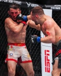 ‘머신’메랍드발리시빌리가고장났다.그의무한테이크다운이‘표트르대제’표트르얀에게완전히막히며패배했다.‘챔피언’메랍은7일(한국시간)미국네바다주라스베거스T-모바일아레나에서열린얀과의UFC323메인이벤트밴텀급타이틀전에서5라운드만장일치판정패배,14연승마감했다.이로써메랍은‘1년4차방어’라는새역사에도전했으나결국마지막순간무너지고말았다.그가자랑하는무한테이크다운은얀에게완벽히막혔고타격전에서도압도당하며대패했다.‘챔피언’메랍은7일(한국시간)미국네바다주라스베거스T-모바일아레나에서열린얀과의UFC323메인이벤트밴텀급타이틀전에서5라운드만장일치판정패배,14연승마감했다.사진=블리처리포트SNS반면얀은2023년1차전패배후2년의기다림끝메랍을잡아냈다.그리고2020년조제알도를꺾고첫밴텀급챔피언이된후5년만에다시왕좌에올랐다.메랍은1라운드시작과함께테이크다운보다는타격전으로얀을공략했다.얀의날카로운잽도위력적이었으나메랍의적극적인전진,타격은더매서웠다.반전은1라운드중반에발생했다.얀의강력한펀치가메랍을크게흔든것.이때메랍은곧바로레슬링으로전환,얀을노렸다.얀의수비는단단했으나메랍은포기하지않았다.다만테이크다운에성공하지못하면서1라운드를사실상내줬다고볼수있었다.2라운드도메랍의레슬링은얀에게통하지않았다.타격전에선얀의날카로움이메랍의적극성을이겨냈다.오히려얀이메랍을상대로테이크다운에성공했다.다시일어선메랍은얀을넘기려고했으나제대로성공하지못했다.얀의강력한펀치가메랍의안면을향해꾸준히적중했다.그럼에도메랍은흔들리지않았고계속압박,2라운드를끝냈다.메랍은‘1년4차방어’라는새역사에도전했으나결국마지막순간무너지고말았다.그가자랑하는무한테이크다운은얀에게완벽히막혔고타격전에서도압도당하며대패했다.사진=AFPBBNews=News13라운드에는얀이길로틴을노린메랍을아예넘겨버리는모습까지연출했다.그러나메랍은얀을아예들어버리는모습을보였다.얀의정확한대응에도메랍의레슬링은계속됐다.문제는영양가가떨어졌다.서로잽을주고받은3라운드막판,얀의기가막힌바디킥이적중,메랍을크게흔들었다.그렇게얀이3라운드마저가져갔다.4라운드초반,메랍은얀을상대로초크승부를걸었다.그러나얀의수비는견고했고오히려그라운드싸움에서메랍을앞서는모습을보였다.타격전에서도확실한우위를가져간얀.그는메랍의얼굴을완전히엉망으로만들었고바디에강력한펀치까지적중,4라운드마저지배했다.5라운드도다르지않았다.얀은메랍의테이크다운을모두막아냈고타격전은압도했다.심지어경기종료직전에는메랍을상대로완벽한테이크다운을성공시키며확실한마침표까지찍었다.그렇게그는만장일치판정승을거두며밴텀급왕좌에다시올랐다.‘머신’메랍드발리시빌리가고장났다.그의무한테이크다운이‘표트르대제’표트르얀에게완전히막히며패배했다.사진=AFPBBNews=News1[민준구MK스포츠기자]