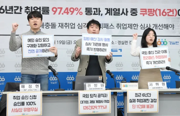 대기업재취업은126건달해‘개인정보유출’쿠팡만16건LG11건,SK10건,삼성9건임원급고위직재취업57.8%19일서울종로구경제정의실천시민연합강당에서열린국회공직자퇴직후취업현황발표기자회견에서참석자들이구호를외치고있다.[경제정의실천시민연합]최근6년간4급이상국회퇴직자10명중3명가량이대기업에취업한것으로조사됐다.이를포함해전체퇴직자의절반이상이민간기업으로자리를옮긴것으로나타났다.국회퇴직자대부분이취업가능혹은승인결정을받은가운데,심사를담당하는국회공직자윤리위원회가사실상‘취업승인발급처’로기능하고있다는비판이나온다.경제정의실천시민연합(경실련)은19일기자회견을열고2020년부터2025년까지국회공직자의취업심사438건을전수분석한결과를발표했다.조사대상은국회의원,보좌진,국회사무처관계자등이다.경실련에따르면,심사대상자중국회보좌진이251명(57.3%)으로가장많았고,국회의원이102명(23.3%)으로뒤를이었다.이는국회공직자재취업이주로의원실인력을중심으로이뤄졌음을보여준다.취업제한심사를신청한405건중394건(97.3%)이취업가능결정을받았고,취업승인심사를신청한33건은모두승인됐다.취업제한심사는퇴직공직자가재직당시업무와밀접한관련이있는기관에취업할수있는지를가리는절차이고,취업승인심사는제한대상이라도예외사유가있는경우취업을허용할지를판단하는제도다.퇴직자들의취업처중에서는삼성,현대차,SK,LG등대기업계열사가126건(28.8%)으로가장많았다.이어중견·중소·일반민간기업113건(25.8%),공공부문78건(17.8%),로펌등전문서비스법인61건(13.9%),협회조합등이해관계단체가48건(11%),민간교육의료연구기관이12건(2.7%)순이다.대기업계열사와중견기업계열사등으로의취업제한심사135건중취업가능·승인결정이난130건을추가로조사한결과,국회퇴직자들이가장많이이동한계열사는최근개인정보유출사태가발생한쿠팡(16건)인것으로드러났다.보좌관15명과정책연구위원1명이국회에서쿠팡으로자리를옮겼다.이외에도△LG계열11건(보좌관7명,국회의원4명)△SK계열10건(보좌관9명,국회의원1명)△삼성계열9건(국회의원3명,보좌관2명,입법차장2명,사무차장1명,의장비서실장1명)△KT계열8건등주요대기업계열사에다수취업했다.소관상임위에서예산과법안을심사하는등피감기관을감시하던위원이퇴직후해당기관의장으로자리를옮기는경우,규제관련핵심상임위경력을가진의원들이대형회계법인의고문으로이동하는사례도있었다.전체심사통과자438명중임원급이상고위직으로재취업한경우는253건(57.8%)에달했다.전직국회의원의경우79명(77.5%)이고위직으로취업했다.기업과기관들이국회출신인사를‘입법리스크관리’와‘네트워크활용’을위한핵심자원으로인식하고있음을보여준다고경실련은분석했다.경실련은“규제와입법이슈가많은기업일수록국회출신인력을적극적으로영입하는‘전략적쏠림’현상이뚜렷했다”며“정무위·기재위·산자위·과방위등기업활동에직접적영향을미치는상임위위원들이퇴직후규제대상인관련대기업이나금융회사로직행한다면이해충돌소지가있다”고지적했다.경실련은△국회의사정을고려한직무관련성심사강화△기관업무기준적용확대(보좌진포함)△취업승인요건강화△심사결과에서구체적사유공개의무화등의제도개선을촉구했다.Copyright©매일경제&mk.co.kr.무단전재,재배포및AI학습이용금지