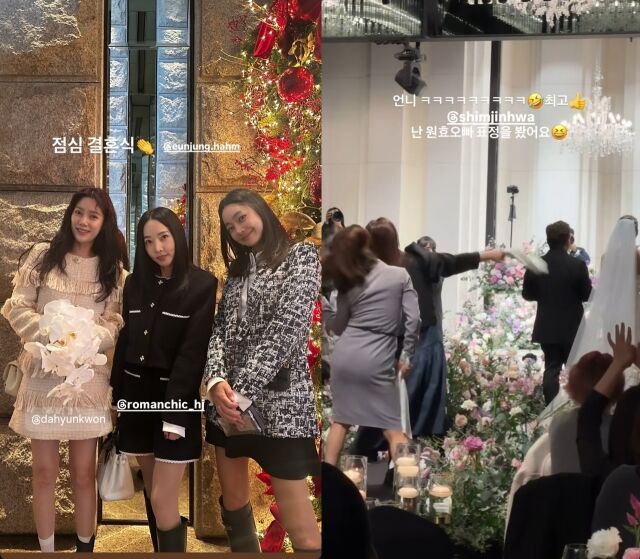 배우서효림이하루에결혼식을두번참석한인증샷을남겼다./서효림인스타그램[마이데일리=김하영기자]배우서효림이하루에결혼식두곳을오가며'하객두탕'을성공적으로치른근황을전했다.서효림은지난달30일자신의소셜미디어(SNS)계정에"점심결혼식"이라는글과함께사진여러장을게재했다.공개된사진에는이날티아라멤버겸배우함은정과김병우감독의결혼식에참석한서효림이에픽하이미쓰라의아내이자배우권다현,패션디자이너최혜정과함께한인증샷이담겼다.배우서효림이코미디언윤정수·원진서결혼식인증샷을남겼다./서효림인스타그램이어"저녁은윤정수오빠결혼식드디어!!축하해,오빠"라는글과함께11살연하원진서와결혼한코미디언윤정수의결혼식현장을공개해눈길을끌었다.사진에는결혼행진중인윤정수의모습이담겼고,함께게시된영상에는코미디언심진화가신랑·신부뒤에서유쾌하게손수건을흔드는장면이포착됐다.서효림은"언니최고.난원효오빠표정을봤다"고덧붙이며웃음을자아냈다.이처럼11월의마지막날연예계에는세쌍의부부가탄생했다.함은정·김병우감독,윤정수·원진서부부를비롯해배우박진주도비연예인신랑과백년가약을맺었다.그중서효림은점심에는배우하정우가축사를맡은함은정·김병우감독,저녁에는김숙·남창희가사회를맡은윤정수·원진서결혼식에연달아참석하며바쁜하루를보냈다.한편서효림은2019년고(故)김수미의아들이자나팔꽃F&B대표정명호와결혼해슬하에딸을두고있다.Copyright©마이데일리.무단전재및재배포금지.