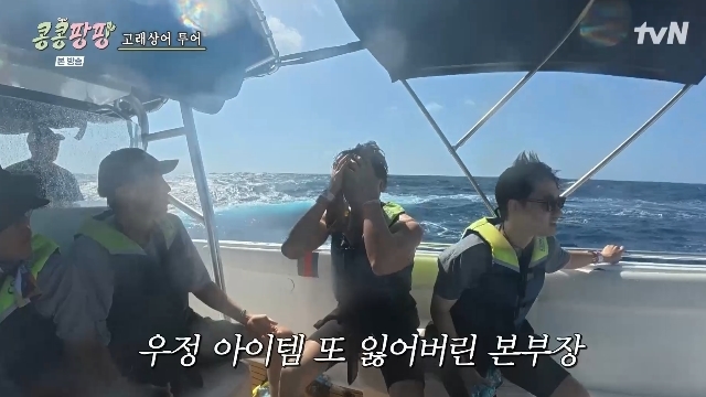 tvN‘콩심은데콩나서웃음팡행복팡해외탐방’캡처tvN‘콩심은데콩나서웃음팡행복팡해외탐방’캡처[뉴스엔서유나기자]엑소멤버겸배우도경수의우정템분실에배우이광수,김우빈이폭발했다.11월28일방송된tvN예능'콩심은데콩나서웃음팡행복팡해외탐방'(이하'콩콩팡팡')7회에서는KKPP푸드대표이사이광수,감사김우빈,본부장도경수의회사발전을위한인사이트탐구목적멕시코해외탐방기가이어졌다.이날탐방단은고래상어투어에앞서새로운우정템모자를사비로구매했는데,이후고래상어를보러가는배안에서거센바람과파도에도경수가쓰고있던모자가날아가버렸다.도경수가"괜찮다.It'sOkay"라며그냥가자고하자김우빈은"왜It'sOkay냐"고버럭했다.도경수는이에"(줍는건)더위험하지않냐"고말했고이광수는"팔찌도잃어버리고모자고잃어버리고"라고잔소리했다.도경수는안전을위해안주워도된다고거듭말했지만선장님은배를멈추고뜰채로모자를포획해줬다.결국우정템구하기에성공한이광수는"오늘은이모자건졌으니돌아가겠다"고말했고장시간항해에지친김우빈도"형집에가고싶어요"라고토로해웃음을자아냈다.뉴스엔서유나stranger77@기사제보및보도자료[email protected]ⓒ뉴스엔.무단전재&재배포금지Copyright©뉴스엔.무단전재및재배포금지.
