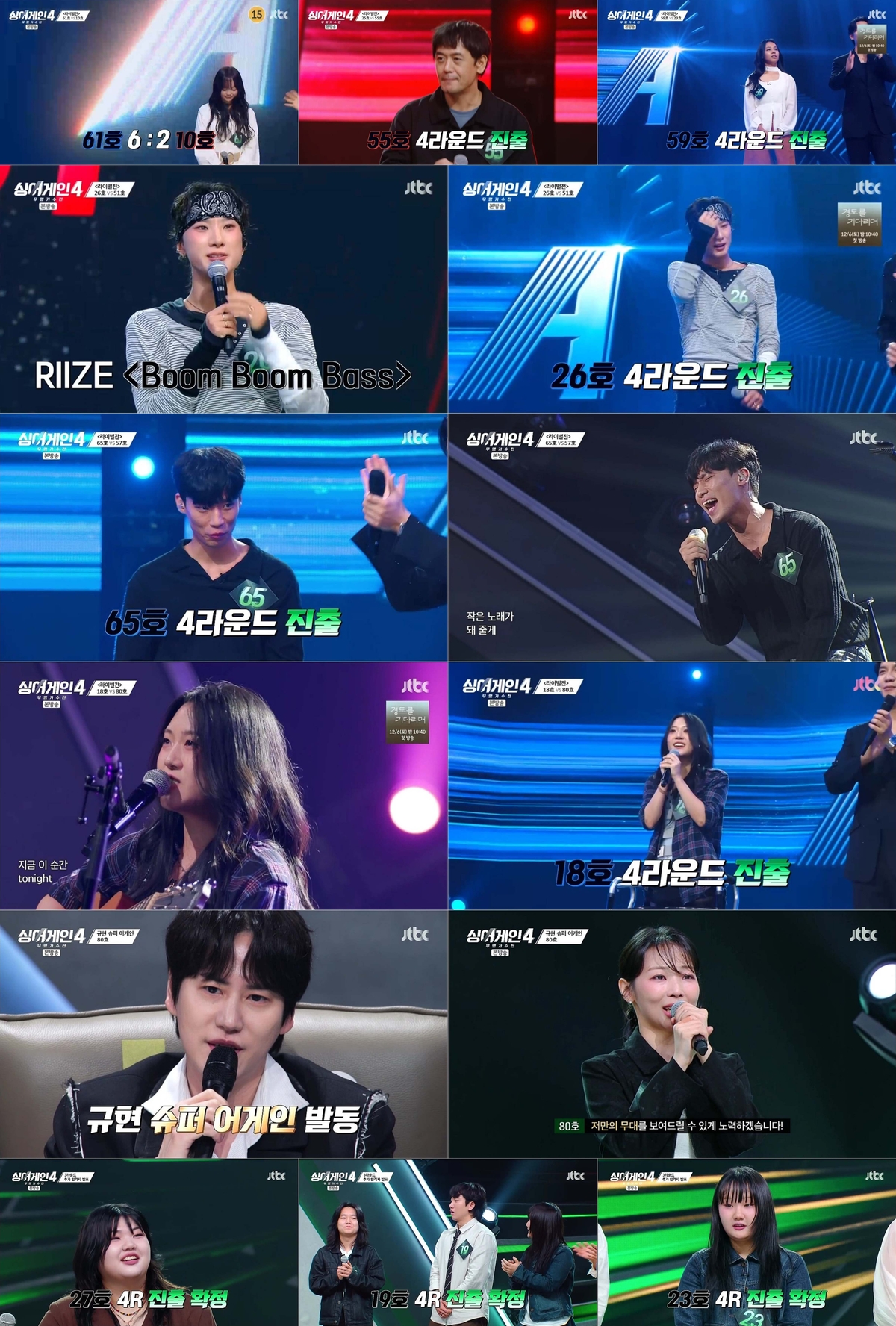 JTBC‘싱어게인-무명가수전시즌4’4라운드진출자가결정됐다.지난25일방송된JTBC‘싱어게인-무명가수전시즌4’(기획윤현준,연출위재혁/이하‘싱어게인4’)7회에서는마지막까지예측불가한3라운드라이벌전이펼쳐졌다.무명가수들의진심이담긴뜨거운승부는경연그이상의무대로시청자들을열광시켰다.이날의포문은51호가열었다.대중에게한걸음다가가고싶었다는51호는이문세의‘빗속에서’를자신만의소울을담아열창했다.김이나는“굉장히모던하다.깔끔하고멋진무대”라고말했고,윤종신역시“진하게가슴을울리는게느껴졌다”라면서호평했다.후공으로나선‘조선팝창시자’26호는그룹라이즈(RIIZE)의‘BoomBoomBass(붐붐베이스)’라는예상밖선곡으로모두를놀라게했다.국악과케이팝이절묘하게어우러진편곡은팝한비트위에전통의소리를녹여내며신선함을더했다.백지영은“조선팝의위상을떨칠것으로기대된다”라면서묘한매력이있는무대를높이평가했고,임재범은“서양음악하고조화를이루는가운데한국의전통소리가빠지지않는다”라면서“요쏘섹시”라는최고의극찬을남겼다.각자의확고한스타일이돋보인무대는26호가만장일치‘올어게인’을받으며4라운드에진출했다.예상밖의대결도있었다.반전의‘록키즈’였던61호가초고음샤우팅으로화제를모은10호를지목한것.61호는조용필의‘바람의노래’를록기반의편곡으로재해석하며새로운변화를꾀했다.태연은“계속듣고싶게만드는톤”이라고61호의독보적인음색을호평했지만,규현과코드쿤스트는매력적인목소리가편곡에묻히는느낌이라아주살짝아쉬웠다는평을남겼다.이에맞선10호는자신의강점인폭발적인가창력을강조할수있는서문탁의‘사미인곡’을선곡했다.도입부터거침없는샤우팅으로분위기를압도한무대에백지영은“샤우팅이뭔지,록이뭔지보여줬다”라면서록스피릿넘치는무대에호응했다.그러나임재범은“‘사미인곡’에대한표현을더욱자기화해서할수있었을텐데아쉽다”라면서록선배로서후배를향한진심어린조언을건넸다.결과는61호가6어게인,10호가2어게인을받으며61호가4라운드에직행하게됐다.25호와55호는감성으로정면승부를펼쳤다.선공인55호는‘자신이해온음악을제대로선보이자’라는각오로올랐다.이소라의‘사랑이아니라말하지말아요’를깊이있는목소리로소화하며진한울림을전했다.김이나는“이시대에필요한목소리”라면서55호특유의호소력있는보컬을높이평가했다.태연은“잔잔한멜로영화보는듯한기분”이라고평을남겼고,규현은“우리에게해주고있는이야기를현장에서듣고있는느낌이들었다”라면서짙은여운을남긴무대에찬사를보냈다.25호는동물원의‘거리에서’를애절함을더해재해석했다.고조되는감정을섬세하게표현한무대에백지영은“반짝이는진주를발견한것같은기분”이라면서뿌듯함을드러냈다.임재범역시“이미고수반열에들어간것같다”라면서“SO잘했어요”라는“참잘했어요”보다한단계높은심사평을선사했다.태연마저고민에빠지게한대결결과는1어게인차이로55호가승리를거뒀다.탄탄한실력으로무장한18호,23호,59호,80호조는심사위원단의감탄을자아냈다.지목권을가진59호는팬심을담아23호를대결상대로지목했다.59호는장혜진의‘1994년어느늦은밤’을가족에게편지쓰는마음을담아감정의밀도가다른무대를완성했다.백지영은“‘세월이가면’이떠올랐다”라면서“59호님의노래그자체를들어야겠다는마음이들면서감동했다”라고말했다.윤종신은“프로듀서의꿈같은목소리가나타났다”라면서“대형가수를또만나게된게아닌가생각이든다”라면서59호의보컬이가진장점을크게칭찬했다.23호는이정선의‘그녀가처음울던날’을통해어머니와의추억이담긴진솔한무대를선보였다.규현은“가사의내용을잘이해하고,본인이느끼는감정을들려주는느낌을받았다”라면서,코드쿤스트는“오늘본무대중에이상하게울컥하는지점이있는무대”라면서감정전달력을높이샀다.심사위원단의감성을자극한대결은59호가5어게인,23호가3어게인을받으며59호가4라운드에진출하는쾌거를이뤘다.18호와80호대결은백지영이인정한빅매치였다.선공에나선80호는지난시즌2라운드에서아쉬운탈락의고배를마신만큼,처음오르게된3라운드무대에임하는각오가남달랐다.자신을각인할수있는인상깊은무대를위해고민하던80호는이소라의‘제발’을선곡해애절한감성을가득표출했다.심사위원의반응은살짝갈렸다.백지영은곡해석이나표현력은칭찬했지만,“여유가없었다”라고조금의아쉬움을전했다.하지만규현은“80호님의‘제발’이저한테너무감동적인노래였다”라는진심이담긴심사평으로80호의눈물샘을자극했다.이어무대에오른18호는휠체어없이무대에올라모두의시선을집중시켰다.어렸을때부터동경해온가수이효리의‘U-Go-Girl(유고걸)’을어쿠스틱스타일로재해석한18호는기존의이미지와는다른성숙함을보여줬다.김이나는“소리적으로섹시함이느껴지는데그부분이오늘의킥이었다”라고매력적인발음에호응했고,코드쿤스트는“되게좋은자작곡같았다.음악성이있는사람이구나느꼈다”라는말로18호의신선한편곡에박수를보냈다.치열했던
