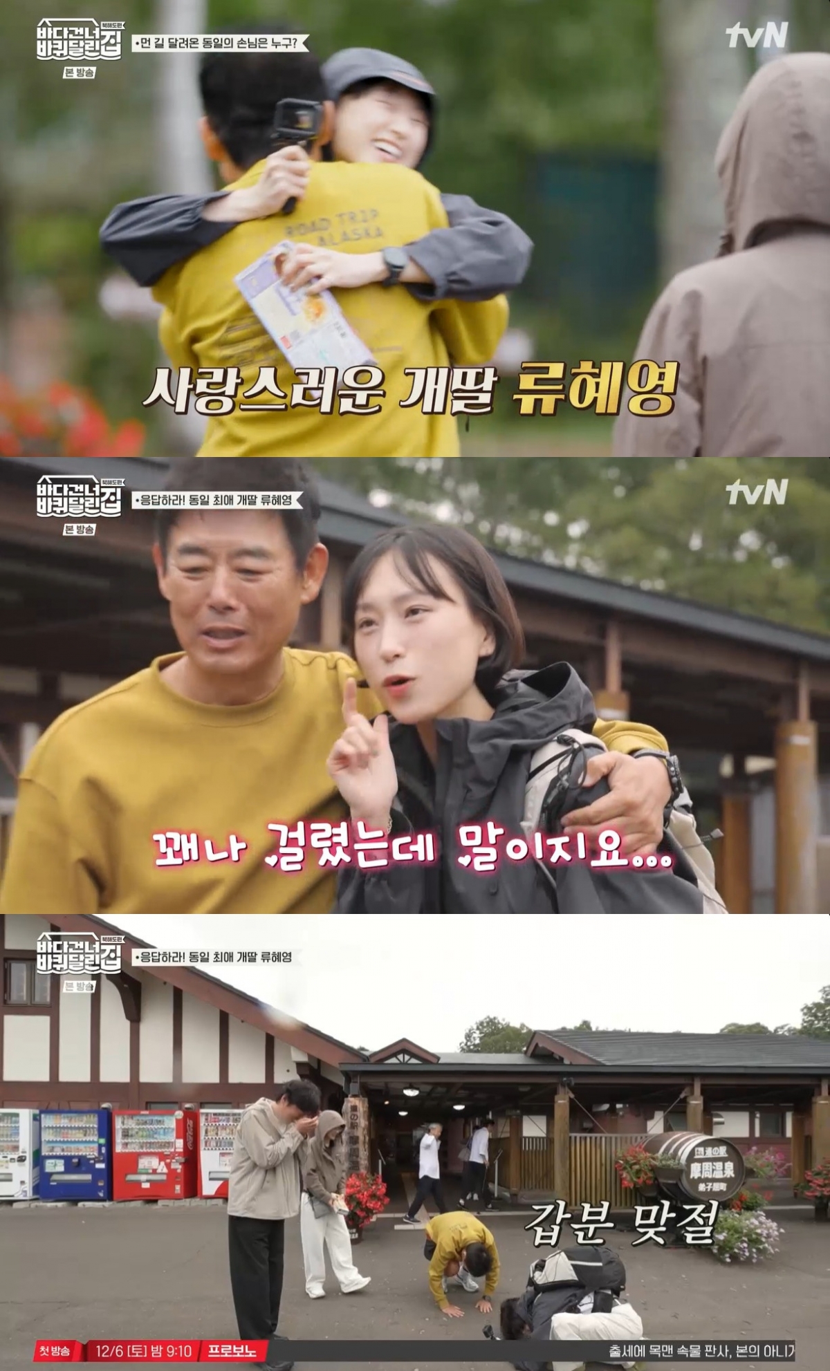[스타뉴스|안윤지기자]/사진=tvN'바다건너바퀴달린집:북해도편'방송캡처'바퀴달린집'배우류혜영이게스트로출연했다.23일방송된tvN'바다건너바퀴달린집:북해도편'(이하'바달집')에서는비에이지역을떠나일본최대칼데라호인굿샤로호수로떠났다.이날성동일,김희원,장나라는장소를옮기면서"사람도없고차도없는데"라고두려움을보였다.장나라는"인터넷신호도잘안되기시작했다.그렇게들어간세명.."이라고하자,성동일은"말이씨가된다고"라고했다.성동일은'개딸'로불렸던류혜영의방문에들떴다.그는"추우면집도태워줄수있다"라며강한의지를보였다.루혜영은성동일에게"아빠"라며기쁜웃음을보였다.그는"중간에전화도안터졌다"라며먼길을돌아왔다는걸알리자,성동일은큰절하며"미안하다"라고사과했다.한편'바달집'은매주일요일오후7시40분에방송된다.안윤지기자[email protected]©스타뉴스&starnewskorea.com,무단전재및재배포금지