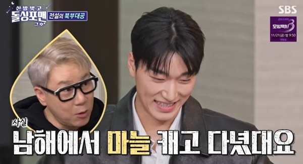 에이티즈산/사진=SBS돌싱포맨캡처[스포츠투데이임시령기자]'돌싱포맨'에이티즈산이반전매력을드러냈다.18일방송된SBS예능'신발벗고돌싱포맨'에서는샘해밍턴,최현우,우주소녀다영,에이티즈산이출연했다.이날김준호와탁재훈은산의몸을보더니감탄했다.산은운동으로다져진근육이라며뿌듯해했다.이상민은"8인조보이그룹에이티즈멤버다.한국남자아이돌최초로코첼라에입성했다"며"산은마피아보스같다며'북부대공'이라는이름이붙여져인기가높아지고있다"고말했다.산은화제가된안경퍼포먼스에대해서도"머리를흔드는동작이있었는데,그때쯤안경이내려오는것을예상하고그때올리면멋있을것같다는생각을했다"고밝혔다.이상민이"남해에서마늘을캐고다녔다더라"고하자산은"남해군출신이다.어렸을때아르바이트로마늘을캤다.시골소년처럼자랐다.시간있으면내려간다.남해출신1호아이돌이다"라고말했다.당시마을현수막에도걸렸다고.산은"BTS선배님물렀거라라고적혀있었다.지역에서경사라서기쁜마음에해주셨는데,엄마저건안될것같다고말씀드렸다"고수줍게얘기해웃음을안겼다.[스포츠투데이임시령기자[email protected]]Copyright©스포츠투데이.무단전재및재배포금지.