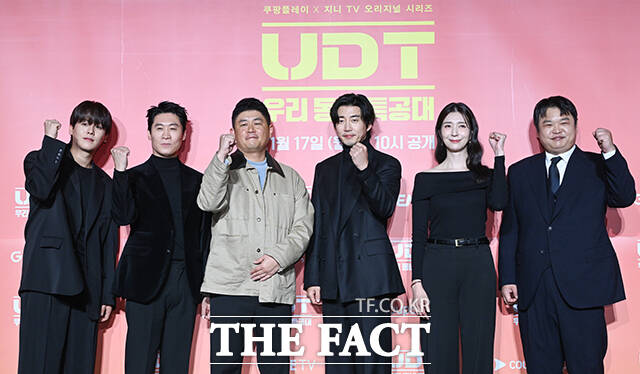 '범죄도시'이후무려8년만의재회'우리동네특공대',안방극장에사이다안길예정배우이정하와진선규,조웅감독,배우윤계상,김지현,고규필(왼쪽부터)이17일오후서울광진구풀만앰버서더서울이스트폴그랜드볼룸에서열린쿠팡플레이X지니TV오리지널시리즈‘UDT:우리동네특공대’제작발표회에참석해포즈를취하고있다./서예원기자[더팩트ㅣ김샛별기자]배우윤계상과진선규가8년만에재회해이번에는안방극장을점령하기위해나섰다.코미디라는장르까지장착한두사람이'착한여자부세미'의인기를뛰어넘을수있을지이목이집중된다.쿠팡플레이X지니TV새오리지널시리즈'UDT:우리동네특공대'(극본김상윤,연출조웅)제작발표회가17일오후서울광진구자양동풀만앰버서더서울이스트폴에서진행됐다.현장에는조웅감독을비롯해배우윤계상진선규김지현조규필이정하가참석해작품에관한다양한이야기를전했다.'UDT:우리동네특공대'는나라를지키기위해서도아니고지구평화에는더더욱관심없는,오직내가족과우리동네를위해뭉친예비역특공대의유쾌하고짜릿한이야기를그린시리즈다.이날조웅감독은작품에관해캐릭터간의케미가무엇보다중요한드라마라고강조하며캐스팅에공을들였다고밝혔다.그는"사건이발생하면서이야기를따라가기만하는것이아니라인물들의부딪힘과긴장감과유쾌함도있어야했다"며"이자리의다섯배우를포함해빌런역할을한배우분들까지내가생각하는최고의조합으로탄생해감사하다"고밝혔다.윤계상이특작부대요원출신보험조사관최강역을맡았다.그는"액션을더늦기전에해보고싶다는마음이있었던터에최강역할이그런모습들이주로이뤄지는역할이라기회가찾아와출연을결정했다"며"이중적인캐릭터다.평상시보여지는모습과달리위기상황에처해졌을때다른모습인본캐가나오는데매력적으로다가왔다"고출연이유를전했다.갈증을해소하기위해액션장르를택한만큼윤계상의마음에드는액션장면도나올예정이다.그는"액션장면이상당히많다"며"2부에특히나공들인액션이있다.그걸해내면서아직은액션을해도될나이라는생각이들었다"고말해웃음을자아냈다.진선규가기술병출신의동네청년회장이자철물점과문구점을운영하는곽병남을연기한다.그는"내가갖고있는착한느낌보다테토남느낌을보여드리고싶었다"며"이를위해수염도붙이고그리기도했다.이동네어딘가에저런사람이있을거같은느낌으로캐릭터를만들었다.드라마를보시면충분히그마음을느끼실것"이라고자신했다.이번캐릭터를연기하며동네의자율방범대에게감사했다고.그는"안보는사이동네를순찰하고계신분들덕분에내가안전히다닐수있었다는걸깨달았다"며"그분들을위해서라도분리수거를앞으로더잘해야겠다는생각이들었다"고말했다.배우진선규(왼쪽)와윤계상이2017년개봉한'범죄도시'이후무려8년만에재회한가운데두사람의호흡에기대가모인다./서예원기자무엇보다윤계상과진선규가지난2017년개봉한영화'범죄도시'이후무려8년만에재회했다.이에다른결의캐릭터로다시한번호흡을맞출두사람의케미에이목이집중됐다.윤계상은"이번에는더강력한케미를보여줄수있을것"이라며"그만큼호흡이더좋다"고자신해기대감을높였다.그는"개인적으로선규형을너무좋아한다.인간적으로도좋아하고배우로서도존경하는사람"이라고진선규에대한애정을드러냈다.진선규또한"소떡소떡같은사이"라며"운명에가까운사이"라고화답했다.이어윤계상은"형과평소에도농담을많이하면서노는데그모습이작품에도그대로반영됐다"며"때문에우리가노는건지연기를하고있는건지헷갈릴정도"라고호흡을자랑했다.진선규는"'범죄도시'때처럼한명한명캐스팅될때마다모여서같이리딩하고연습하며캐릭터를혼자가아니라함께만들어가고고민했다"고화기애애했던현장분위기를전했다.그러면서도"달라진것이있다면8년전에는장첸밑에있었다면,지금은청년회장으로서둘이동등한입장"이라고너스레를떨어웃음을안겼다.배우이정하와진선규,윤계상,김지현,고규필(왼쪽부터)이'UDT:우리동네특공대'로때로는감동을때로는웃음을전할예정이다./서예원기자두사람외에도김지현이특임대조교출신의마트사장정남연을연기한다.김지현은"정남연은부녀회회장으로동네일에관심이많다"며"마트에서는잘웃고손님들에게친절하다.그러나동네에일이터지면특임대조교출신으로단단하고카리스마있는모습들이나온다"고반전매력을예고했다.고규필은사이버작전병출신의체육관장이용희역을맡았다.그는이번캐릭터를연기하기위해자신이어렸을때다닌태권도장사범들을떠올렸다고.고규필은"어렸을때재밌는사범님들밑에서재밌게배웠던기억이있다.생각보다애들상대하는게힘들더라.그럼에도도장에서재밌게찍었다"고돌이켰다.막내이정하는박격포병출신엘리트공대생박정환역으로분한다.그는막내로서선배들과현장에서함께하며"너무따뜻했다.현장가는게즐거워서기다려지는현장이었다"고전했다.특히특공대리더는김지현을꼽았다.이정하는"현장에서도작품에서도지현누나가한마디하면우리는모두압도됐다"고말해웃음을자아냈다.대놓고히어로장르를표방하는만큼다소사건해결과정이비현실적일수있지않느냐는