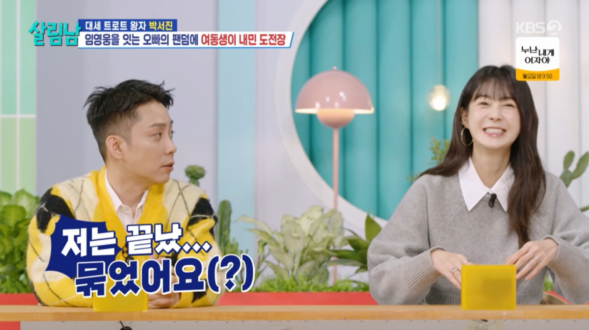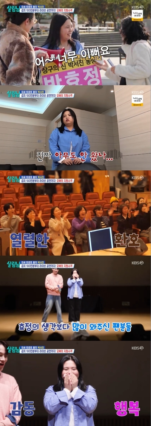 ‘살림남’.사진lKBS오정태아내가남편을선택한이유를밝혔다.15일오후방송된KBS2‘살림하는남자들시즌2’(이하‘살림남’)에는박서진,지상렬의하루가공개됐다.이날방송에는첫번째살림남으로박서진남매가모습을보였다.서진은본인을좋아해주는팬들이편지를써줬다며선물을정리하는동생효정을보고“난팬레터이만큼있다”고놀렸다.효정은“나팬카페,팬미팅하면뭐해줄건데?”라고하자서진은“팬이있다고증명하면‘2025연예대상’원탁테이블에앉을수있는지물어봐줄수는있다”고제안했다.팬카페만들기에나선효정은“내팬클럽나물이들이다.오빠팬클럽이름이닻별이잖아.난그옆을감싸주고지켜주는뜻으로뚱별”이라고정했다.이후투덜거리면서효정의팬미팅상황극까지참여해줬다.서진은“언니실물로보니까너무예쁜데애교보여주면안되냐”라고기습제안했다.효정이애교를안보여주자서진은“실망이다.탈덕할래요”라고말해효정을당황하게했다.그사이팬카페회원은한명이늘었다.그러나본인을포함해회원2명에서그치자크게상심한효정은새벽1시에비빔밥을먹었다.효정은“기세등등하게말했는데아무도안오면오빠가놀리면어떡하나해서스트레스받아서밥을비볐다”라고인터뷰에서속마음을말했다.서진은“넌몸무게만느는거다.지금이시각에도내팬카페회원수는늘고있다”라며경고했다.서진은동생에게왜팬카페를만들라고했냐는질문에“효정에게안좋은댓글이달린다.실제로팬분들을만나서이렇게사랑받는다는걸알면자존감이올라갈것같아서권유한것.오빠로서도와줬다”고솔직하게고백했다.다른날효정은팬들을위해직접김장했다.팬미팅3시간전KBS아트홀에들어선두사람은팬미팅규모를확인하기도.생각보다큰규모에효정은“너무컸다.한줄도솔직히안바랐다.오빠한테증명은해야겠고한명도안오는것보다한두분들르셨으면좋겠다고생각했다”로했다.마음이급해진효정은직접패널을들고팬미팅홍보에나섰다.이제는효정이팬미팅현장으로나가야할때.서진은입장전효정의눈을가렸고아무것도모르는효정은냅다절부터하기도.서진의말에안대를내린효정은10명이나온팬들의모습에감동했다.그는“진짜와주실줄몰랐다.앞으로열심히살겠다”고소감을말했다.팬들은“성격이너무좋다”,“재미있다”,“섹시하다”라며효정의매력을말했다.효정은팬사인회를진행하며사인과김치를직접나눠주며감사인사를전했다.효정은“방송에서보시고저를예뻐해주는분들을실제로만난건잊지못할추억”이라고말했다.‘살림남’.사진lKBS두번째살림남으로는손녀윤아와데이트에나선지상렬이모습을보였다.키즈카페에도착한윤아는잘생긴사람이온다는말에기대했지만지상렬의지인개그맨오지헌과그의딸,오정태를보고실망했다.육아퇴근후근처치킨집으로향한지상렬,오정태,오지헌은못다한대화를나눴다.오정태는어떻게아내를만났냐는질문에“아내가나만보면웃더라.그래서나를좋아하는줄알고나좋아하냐고물었다.아내가좋아한다고해서그렇게만났다”고했다.그러면서“장모님이충격받았다.내외모가너무이상하대.그래서다음날바로아내랑싱가포르로도망가셨다.그런데아내가나한테다시몰래왔다.본인이싱가포르에있을때내가바람피울까봐”라고말해스튜디오를충격에빠뜨렸다.이후지상렬은“사랑한다고문자보내면아내한테어떻게답장이오는지보자”고제안했다.은지원은“난하면바로올것.‘나도사랑해’이렇게.난아직신혼인데”라며자신감을보였다.이요원은“저는보내면큰일난다.무슨일있는줄알고큰일난다.‘어디아파?무슨일있니?’라고올것”이라고말해웃음을자아냈다.오정태아내는전화를받자마자“밥안먹었냐”고먼저물어오정태를당황하게했다.지상렬은“제수씨수많은남자가있는데왜오정태를선택했냐”라고물었고아내는“제가좋아하는개종류와비슷하다”라고말해스튜디오를폭소케했다.또결혼을뭐라고생각하냐는질문에오정태아내는“결혼은책임?”이라고답했고오정태는“사랑아니었냐.자기가개주인인줄아네.요즘사이좋은데왜그러냐”라며서운함을표했다.‘살림남’은매주토요일오후10시45분에방송한다.[서예지스타투데이객원기자]Copyright©스타투데이.무단전재,재배포및AI학습이용금지