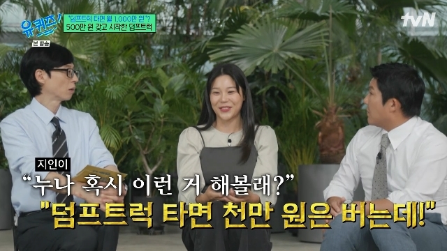 tvN‘유퀴즈온더블럭’캡처tvN‘유퀴즈온더블럭’캡처[뉴스엔서유나기자]덤프트럭계의아이유김보은자기님이덤프트럭기사의수익을전했다.11월5일방송된tvN예능'유퀴즈온더블럭'(이하'유퀴즈')317회에는25.5톤대형덤프트럭을운전하는여성트럭커김보은기사가게스트로출연했다.서른부터시작해5년째덤프트럭을운전중이라는김보은자기님은"저희는건설기계로분류된다.건설사에서나오는토사,원석,자갈,모래등건축자재들을운반한다.주로흙을싣고다닌다.제가서울에서일할때는서울부터인천,김포수도권을다다녔고지금은고향여수로내려가남해,순천,광양등의산업단지로다니고있다"고밝혔다.덤프트럭운전전다양한일을했다는김보은자기님은사회복지사로는2년간일했다며"그일이아마제가해왔던일들중가장가슴따뜻하고뿌듯하고너무나도좋았던일인데페이가너무적었다.현실적으로.'이래서아파트를언제사지'라는막연한마음이들더라.삼촌이동대문도매시장에서일해서그쪽으로옮겼다"며동대문도매시장시절하루매출무려3천만원을찍은사실을자랑했다.하지만심한경쟁등하고싶은일이아니라는생각에자신의일을해보고자쇼핑몰을오픈했다고.자기님은"여성의류를판매했다.제일한다는건좀달랐다.판매보다사업적인부분으로가야했다.그땐어린열기로했는데지금생각하면준비가많이부족했다"고말했다.설상가상코로나19까지겹쳐자기님은쇼핑몰을닫게됐다.자기님은"통장에500만원도안남았는데서른은됐고.합숙하는일자리에들어가서돈을벌까하다가덤프트럭하는지인의'누나혹시이런거해볼래?덤프트럭하면(월)천만원은버는데'라고말해솔깃했다.제가그때승용차도없을때였다.면허는있었으나장롱면허였다.사회복지사때회사에있던경차를몰아본게전부인데면허를따서바로했다.바로운전면허따러가서버스로시험봐서바로합격했다"고밝혔다.처음운전하는날체해서토까지했다는자기님은"포클레인앞에차를잘대야한다.제가잘못대서안실어주고제뒤에덤프트럭30대는대있고처음에그런일이많았다"고초보시절을회상했다.자기님은덤프트럭은개인이구매해야하냐는질문에"처음엔회사에있는차로기사로일을했고,그러다가돈모아서제차를샀다"고답했다.현재덤프트럭3대를보유중이라고자기님은"다은행거다.덤프를접었다가다시시작했을때어느정도목표를이루고싶어서3대는해보자했다.약간재테크식으로차를사고기사월급을드리고나름의지출항목떼고한다.기사를고용하면매출이나오니까이렇게하면되겠다라는생각을했는데망한것같다.요즘경기가너무안좋아지고차수리비가.수리주기가돌아오더라.상황안좋아졌으니제가좀더벌어야한다"고말했다.자기님은덤프트럭새차는한3억정도하지않냐며두MC가놀라자"새차는3억대도있는데저는1억대다.중고로샀다.제건아니고은행거다"라고말했다.이어"기름값은한달400에서500만원,많이나가면600에서700만원도나간다"고밝혀놀라움을자아냈다.무려유지비만한달에1천만원이든다고.자기님은"이일시작할때'아가씨가이일을왜하냐.이일은앞으로벌어뒤로까진다'라고하셨는데정말체감한다.1천만원벌기도했다.한세번정도벌어본거같다.세달천만원찍어본적있는데마이너스나는달도있긴하다.최근수리비가980만원이나왔다"고토로했다.자기님은보통순이익이600에서1000만원인데"지금은한3분의1거의반토막났다"며그이유에대해좋지않는건설경기와잦은비를꼽았다.뉴스엔서유나stranger77@기사제보및보도자료[email protected]ⓒ뉴스엔.무단전재&재배포금지Copyright©뉴스엔.무단전재및재배포금지.