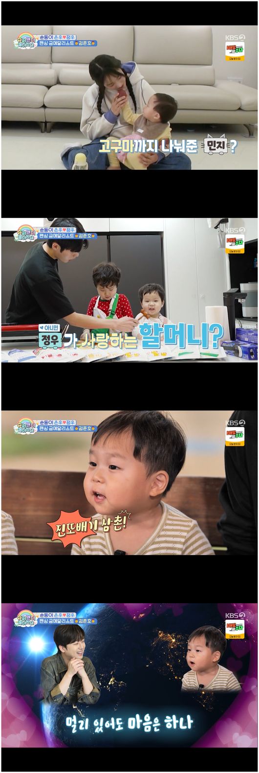 <리뷰:방송시청후작성된리뷰기사입니다.>[OSEN=오세진기자]‘슈퍼맨이돌아왔다’전국가대표펜싱선수김준호의아들정우가진또배기이찬원을향한사랑을드러냈다.5일방영한KBS2TV예능‘슈퍼맨이돌아왔다’(이하‘슈돌’)에서는은우,정우와함께가을나들이를나간김준호의모습이그려졌다.김준호는“일본전지훈련도있고,경기일정도있었고,코칭훈련도있었다”,“올해여름집을비웠기때문에비운만큼아이들에게잘해주려고한다”라고말했다.정우는알밤을주우면서사슴벌레를구경하는등거침없는행보를보였다.김준호는“정우야,진또배기삼촌만나러갈까?”라며슬쩍물었는데정우는“네!진또배기삼촌!”라며외쳤다.이찬원이집에왔을때이찬원에게고기를달라조르며이찬원바라기가된정우.정우는밤을내밀며"삼촌쪄먹어"라며카메라를통해영상편지를남겼다.김준호는“밤딴거누구주고싶어?뉴진스민지누나?아니면할머니?”라며물었다.그러자정우는“진또배기삼촌!”이라며거침없이이찬원을원픽으로뽑아진심을드러냈다./[email protected][사진출처]KBS2TV예능‘슈퍼맨이돌아왔다’Copyright©OSEN.무단전재및재배포금지.