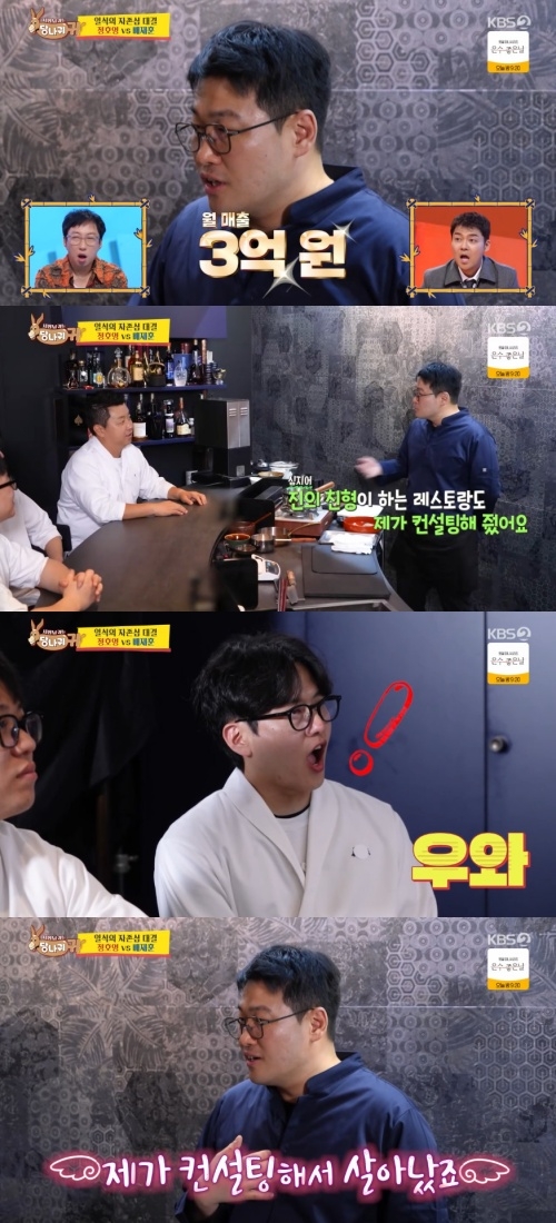 ‘사당귀’.사진lKBS일식대가배재훈셰프가처음으로‘사당귀’에모습을보였다.12일오후방송된KBS2예능프로그램‘사장님귀는당나귀귀’(이하‘사당귀’)에서정호영셰프는배재훈셰프레스토랑을방문했다.이날방송에서배재훈은“특별한분이오시면프라이빗히든공간에서직접음식을해드린다”며“이병헌,태양,신동엽,BTS진이왔었다”고덧붙였다.정호영이“우리도진왔었어.회포장하러이연복셰프님이랑같이왔어.맥주도한잔마셨다”고자랑했다.이에배재훈은“저는앞에서요리다해줘요.진의친형이하는레스토랑도제가컨설팅해줬어요.그래서살아났죠.전월매출3억씩나와요.형님은하루1천만원못찍으세요?안돼냐”며도발했다.‘사당귀’는매주일요일오후4시45분KBS2에서만날수있다.[서예지스타투데이객원기자]Copyright©스타투데이.무단전재,재배포및AI학습이용금지