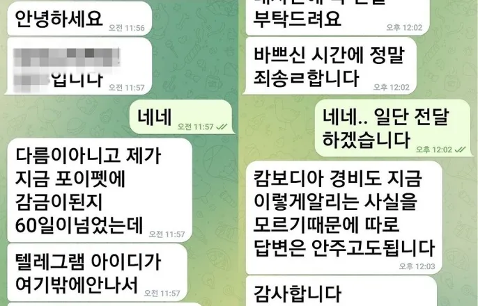 쇠파이프·전기충격기폭행하며피싱가담강요…박찬대의원도움"다른한국인,아직구조기다려"…영사조력법개정안국회에캄보디아범죄단지에갇혔던B씨가구조요청을위해보냈던텔레그램메시지[박찬대의원실제공](서울=연합뉴스)박수현기자=캄보디아에서고문과감금을당하며범죄에가담했던한국인2명이더불어민주당박찬대의원의도움으로현지에서구조됐다.11일연합뉴스취재를종합하면지난2일캄보디아시아누크빌의한호텔에감금됐던한국국적남성A씨와B씨가박의원실의도움으로빠져나왔다.A씨는IT관련업무를하면월800만원에서1천500만원의고수익을보장하고1인1실호텔숙소와식사를제공한다는온라인구인글을보고캄보디아로향했다.처음에는믿음이안갔지만텔레그램으로대화를해보니비행기티켓을끊어준다고해'갔다가아니면다시돌아오면되지'라는생각으로떠난길이었다.막상캄보디아에도착하니회사는공무원을사칭한보이스피싱을시키는범죄단지(웬치)였다.범죄에가담하지않으면온종일고문을하겠다는협박이이어졌다.A씨는"보이스피싱회사라고듣고온것이아니니일을못하겠다고하자조선족이전기충격기를들고와대본을주며'하지않으면매일같이고문당할것'이라고말했다"고회고했다.캄보디아경찰의온라인사기작업장단속[EPA연합뉴스자료사진.재판매및DB금지]처음에는말도안되는상황이라고생각해말다툼을했다.그러자이들은A씨를범죄단지안에대기시켰고,다시한국으로데려다주겠다며짐을싸서차에타라고말했다.차를타고도착한곳은공항이아닌캄보디아포이펫의또다른범죄단지였다.그는이곳에서100여일간가혹한폭행이이어졌다고회상했다.도착하자마자짐을빼앗겼고,수갑을찬채로쇠파이프와전기충격기등으로구타당했다.기절하면얼굴에물을뿌리고전기충격을가해정신을차리게한뒤다시금폭행했다.가혹한시간을보내던중A씨와같이방을쓰던B씨가텔레그램으로구조요청을보냈다.그덕에현지경찰이한차례범죄단지에찾아왔지만,신고사실이발각돼탈출이무산됐다.두사람은머리에봉지가씌워진채차량트렁크에넣어져시아누크빌로보내졌다.위치가발각됐으니거점을옮겨야한다는중국인관리자의판단이었다.그곳에서도일할때는발목에,일하지않는시간에는침대에수갑으로묶인채감금됐다.매출10억원을달성하면돌려보내주겠다는범죄가담강요도이어졌다."한번더신고하면파묻어버리겠다","소각장에서태우겠다","현지경찰에작업이돼있으니(신고하면)죽이겠다"는중국인관리자의위협도뒤따랐다.기지를발휘한A씨가구조요청을하면서현지경찰이두사람이머물던호텔에찾아왔고,이들을감시하던중국인과조선족에게수갑을채우면서마침내160여일간의감금생활이끝났다.A씨와B씨는구조된뒤캄보디아경찰의조사를받으며귀국을준비중이다.캄보디아의한사기작업장건물[로이터연합뉴스자료사진.재판매및DB금지]A씨는캄보디아범죄단지에갇혀있을당시바로옆방에도한국인3명이있었다며아직도많은한국인이구조를기다리고있을것이라고말했다.A씨는"저희는의원님등많은분이도와주셔서운이좋아구조가된것이고다른한국인들은아직도구조를기다리는상황"이라며안타까워했다.박찬대의원실은지난달초B씨어머니로부터"우리아들을꼭살려달라"는요청을받은뒤외교부,영사관등과소통해두사람을구해냈다.박의원실이외교부에서제출받은자료에따르면올해1월부터8월까지캄보디아에서취업사기후감금을당했다며공관에신고한사례는330건에이른다.캄보디아에서일어나는피해사례에비해재외공관의인력과예산이부족해영사조력법개정으로재외국민보호체계를강화해야한다는설명이다.박의원이지난달30일대표발의한영사조력법개정안은재외국민사건사고에대한사전모니터링및평가를진행하고실종신고에적극대응하는등의내용을담고있다.박의원은"지금도구조를기다리는우리국민과한국에서애타게기다리는가족들이있다"라며"국무조정실,외교부등관계기관이적극적인업무협조를통해우리국민을안전하게구출할수있는'골든타임'을확보하길바란다"고강조했다[email protected]▶제보는카톡okjeboCopyright©연합뉴스.무단전재-재배포,AI학습및활용금지