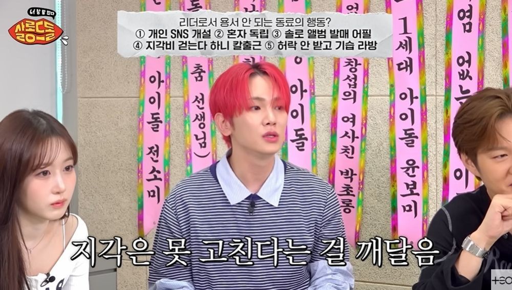 [TV리포트=남금주기자]샤이니키가상습지각을하는멤버를폭로했다.11일유튜브채널'테오'의'살롱드돌'에서는엔믹스해원,릴리가출연했다.이날샤이니키,비투비이창섭,엔믹스해원,릴리는리더라면가장용서안되는동료의행동을고르란말에고민에빠졌다.후보는팀에공유안하고개인SNS개설,회사에공유안하고혼자독립,상습지각하다가지각비걷는다고하니5분전칼출근,회사에허락안받고기습라방등이었다.릴리는'상습지각하다가지각비걷는다고하니칼출근'을언급하며"진짜재수없다"라고돌직구를날렸다.키역시"저거진짜싫다.되는거였네"라고공감했다.그러면서키는"돈과상관없이늦는사람은늦을수있단걸난이제이해하게됐다"라며멤버들과의일화를꺼냈다.키는"해외행사에갔다.호텔에서한명씩,두명씩방을멤버별로따로쓰지않냐.그럼매니저한테모멤버가나올때까지날부르지말라고한다"라고폭로했다.키는"50분에차가출발하면우린되게구체적으로47분까지복도에모여서인솔해서내려가기로한다.그러면47분에신발신는애들이있다"라며"근데(이상황에서지각비를걷는다고하니까)47분에나가서있는다?'지각안할수있었네?'싶지않냐"라고밝혔다.이어키는"SNS는얘기안하고개설했다.나SNS1세대라니까"라고했고,이창섭은"얘는혼자독립하는것도했고"라며"얘는아무한테도말안하고독립했다"라고덧붙여웃음을안겼다.릴리가"만약제가리더라면SNS개설,독립중고민했을것같다"라고했고,키는"그렇지.왜냐하면다같이못하게한건데,자기만하면안되는거니까?"라고인정했다.릴리는"제가리더여도저한텐별상관이없는데,한명이잘못하면모두의인생이힘들어지니까"라고이유를덧붙였다.남금주기자[email protected]/사진=유튜브채널'테오'Copyright©TV리포트.무단전재및재배포금지