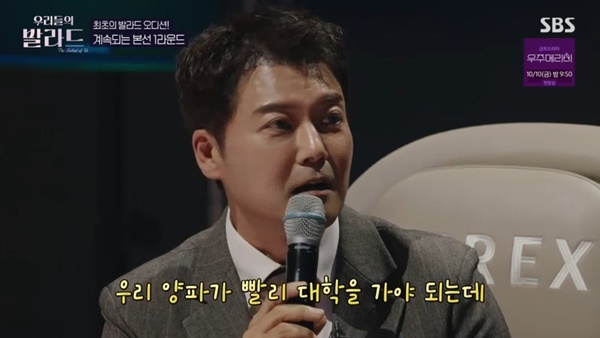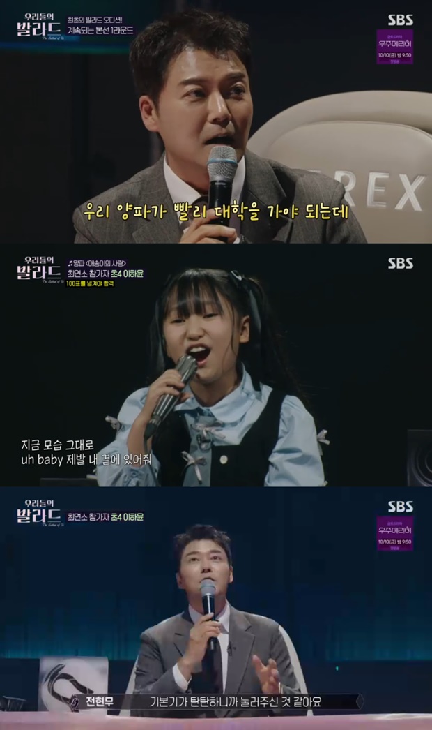 우리들의발라드[티브이데일리한서율기자]'우리들의발라드'에서전현무가가수양파에애정어린팬심전했다7일밤방송된SBS음악프로그램'우리들의발라드'3회에서10살최연소참가자부터제적위기에놓인미대생,5년아이돌연습생출신참가자의간절함을담은무대가펼쳐졌다.이날본선무대에서양파의곡이소개된가운데전현무가양파에대한팬심을드러냈다.그는"당시양파가각방송사마다1위를휩쓸었다.나와나이가비슷한양파가위경련이나서수능을못봤다는소식을듣고울정도로좋아했다.제가생각해도나의팬심이너무아름다웠다"라고밝혔다.이어2015년생인10세참가자이하윤양이등장해양파의'애송이의사랑'을열창했다.그는무대에올라오기직전에도기침을해걱정을불러일으켰으나순수한목소리로감동을선사했다.이하윤양의무대에탑백귀평가단은1절이끝나기전에합격을결정했다.이하윤양은"솔직히합격못할줄알았는데이런결과를주셔서감사하다"라며기쁜마음을드러냈다.[티브이데일리한서율기자[email protected]/사진=SBS'우리들의발라드']우리들의발라드[Copyrightⓒ*세계속에新한류를*연예전문온라인미디어티브이데일리(www.tvdaily.co.kr)/무단전재및재배포금지]Copyright©티브이데일리.무단전재및재배포금지.