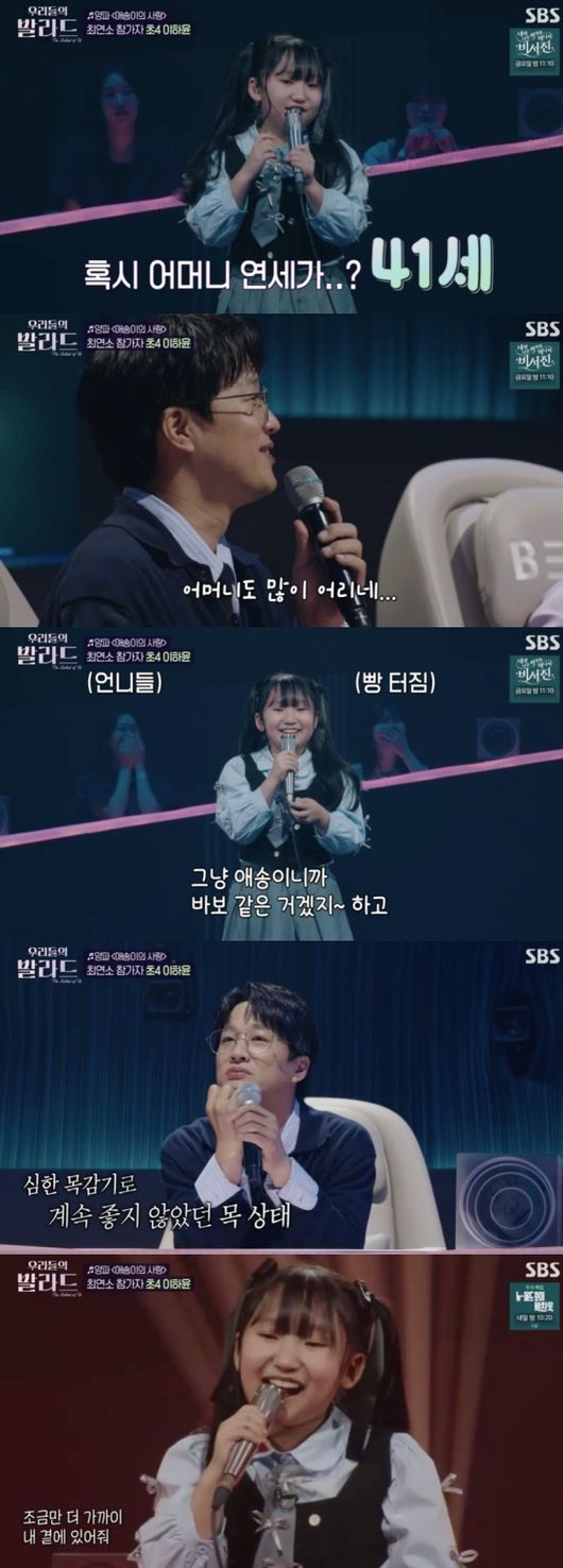 방송시청후작성된리뷰기사입니다.[OSEN=임혜영기자]최연소도전자가등장했다.7일방송된SBS‘우리들의발라드’3회에서는본선1라운드에참여하는모습이그려졌다.최연소참가자인초등학교4학년이하윤은양파의‘애송이의사랑’을선곡했다.그는“어머니가양파팬이셨다.양파언니가엄마보다조금더언니였다고들었다.노래를되게잘해서사람들이좋아하고놀랐다고들었다”라고말했다.이하윤은어머니가41살이라고말했고차태현,전현무는“많이어리네”,“나보다한참동생이야”라며‘현타’가온모습을보였다.차태현은‘애송이의사랑’가사가이해가됐는지물었고,이하윤은“아직까지남자친구를사귄적이없어서이해가잘되진않지만애송이니까바보같은거겠지,하면서부르고있다”라고답했다.이하윤은노래하기전기침을했다.심한목감기로상태가좋지않은것.그는“목이쉰상태라목이너무아프다.목소리가좀잘나왔으면좋겠다”라고속상해했다.정재형은“노래하다가기침이나와도다이해한다”라며위로했다.이하윤의걱정과달리,이하윤은1절이채끝나기도전에합격불이들어왔다./[email protected][사진]SBS‘우리들의발라드’Copyright©OSEN.무단전재및재배포금지.