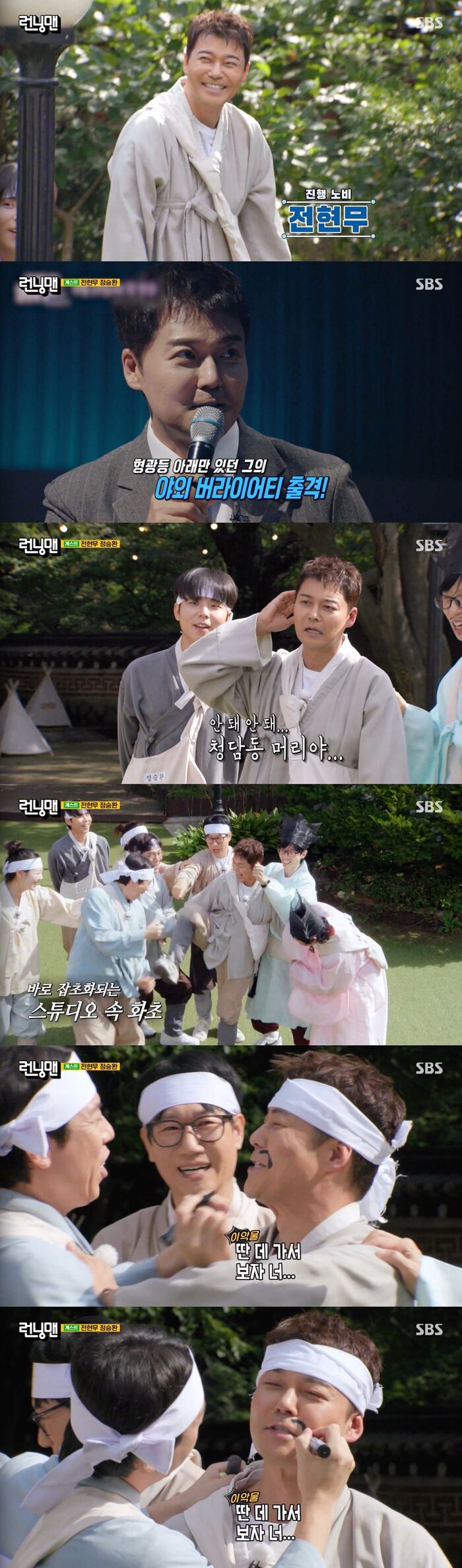 [SBS연예뉴스|김효정에디터]전현무가오랜만의야외예능에출연했다.5일방송된SBS'런닝맨'에서는추수를위해유대감과하대감,그리고노비들이한자리에모였다.이날방송에서는신혼여행으로자리비운김종국을대신해다른노비들이자리를채우러나왔다.대타노비는전현무와정승환.스튜디오전문,실내전문MC전현무의야외예능출격에런닝맨은"갑자기여긴왜왔냐"라며깜짝놀랐다.또한양세찬은"이형은왜멋을부렸어"라며한껏힘을준헤어스타일을지적했다.그리고양세찬은노비들이두르고있는머리띠를대령하며멤버들에게전현무를잡으라고했다.청담동에서한머리라며안된다고극구사양을하는전현무를잡은멤버들.양세찬은노비머리띠도모자라서전현무의얼굴에수염까지그려폭소를자아냈다.이에전현무는"딴데가서보자너"라며다른녹화에서복수를할것이라고예고해눈길을끌었다.Copyright©CopyrightⓒSBS.Allrightsreserved.무단전재,재배포및AI학습이용금지