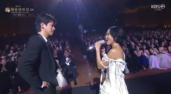 사진=KBS2TV‘제46회청룡영화상’시상식중계캡처사진=KBS2TV‘제46회청룡영화상’시상식중계캡처사진=KBS2TV‘제46회청룡영화상’시상식중계캡처[뉴스엔이하나기자]화사가‘청룡영화상’에서박정민과특별한무대를꾸몄다.11월19일서울영등포구여의도KBS홀에서는‘제46회청룡영화상’시상식이진행됐다.이날시상식후반부에는화사의축하무대가공개됐다.지난10월발매한신곡‘GoodGoddbye’로무대를꾸민화사는흰색드레스에맨발로의자에앉아노래를불렀다.의자에서가볍게몸을흔들며춤을추던화사는일어나객석으로향했고,객석에있던박정민이화사를향해걸어나왔다.앞서박정민은‘GoodGoddbye’뮤직비디오에서화사와이별중인연인을연기해화제를모았다.박정민이빨간색신발을화사에게건네자,화사는신발을던져버린뒤박정민앞에서춤을췄다.두사람은마지막소절을함께불렀고,화사퇴장후박정민은“구두가져가”를외쳐유쾌하게마무리했다.무대후이제훈은“정말멋진한편의영화같은무대였다.일전에박정민씨가저한테‘훌륭한멜로얼굴을가지고있다.근데왜이렇게사서고생하는작품만선택하냐’는이야기를한적이있었는데오늘제가그이야기를돌려드리고싶다.박정민씨당신도너무훌륭한멜로얼굴을가지고있다.많이써먹어달라”고말했다.박정민은검지로입을가리며조용히하라는손짓을보내는가하면칭찬에손사래를쳐웃음을자아냈다.이에한지민은“거짓말이아니라제주변에많은여배우분들께서박정민씨랑멜로연기를꿈꾸고계신다.가까운시일내에박정민씨의로맨스연기를볼수있는날을기대하겠다”라고거들었다.뉴스엔이하나bliss21@기사제보및보도자료[email protected]ⓒ뉴스엔.무단전재&재배포금지Copyright©뉴스엔.무단전재및재배포금지.