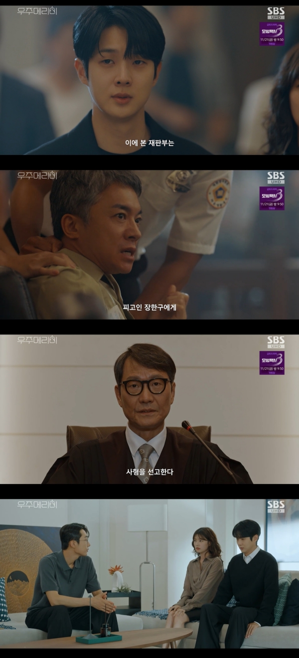 사진=SBS[스포츠투데이김태형기자]서범준이최우식과정소민에게복수하기위해기자회견을열었다.14일방송된SBS금토드라마'우주메리미'11회에는장한구(김영민)가사형을선고받는모습과,김우주(최우식)에게또다른위기가찾아오는과정이그려졌다.이날김우주는감옥에갇힌오민정(윤지민)에게"장한구와공모한증거어딨어요?"라고물었다.오민정은"별장에헨리가아끼는인형이있어.그안에네가찾는증거가있을거야"라고말해줬다.오민정의목덜미에있는문신을본김우주는부모님이죽었던당시의기억을떠올렸다.유메리(정소민)는괴로워하는김우주에게"우주씨괜찮아요?"라며끌어안았다.김우주는"오민정누구인지알것같아요"라며"이유는모르겠지만갑자기그날이떠올랐어요.그날제가본사람은오민정이확실해요"라고말했다.이에유메리는"우주씨기억이맞을거예요.오민정씨25년전에명순당직원이었다는얘기들었거든요"라고했다.이어"오민정씨는그때부터,어쩌면그전부터장이사님과알고있었을거예요.그날사고현장에도있었을수도있고요"라고전했다.김우주는"오민정이별장에고모부랑따로연락하는휴대폰이있다고했어요.그게결정적인증거가될것같아요"라고말했다.장한구는녹음파일을들고가다가김우주와마주쳤다.김우주는"고모부였어요?말해요"라고추궁했고,장한구는"이제라도알아서다행이라고할까?아니면이제알아서무슨소용이냐고할까?"라며순순히인정했다.그러면서"이미그사건은공소시효가끝났어.내가네부모죽인걸알아도넌아무것도할수없다고"라고조롱했다.김우주는"고작당신불륜이들켰다고사람을죽여?"라며분노했다.과거김우주의아버지는장한구의불륜을알게되고사업에서손을떼라고했다.장한구는김미연(백지원)과장응수(고건한)를들먹이며봐달라고사정했다.사건의전말을알게된김우주는"용서해달래놓고부모님을죽인거야?오민정이랑?"이라고물었고,장한구는"뭐어떡하니?내약점을쥐고언제내뒤통수를칠지모르는데.거봐,몰라도될진실이었잖아"라며자리를떴다.하지만장한구앞에는경찰들이있었고,경찰은장한구를명순당횡령죄로체포했다.뒤따라나온김우주는살인교사혐의도추가해달라며블랙박스영상을보여줬다.장한구는뺑소니사고로조사를받던중해외로일주일간도피했고,그기간만큼공소시효가늘어나있었다.경찰은해당사건도조사하겠다며장한구를끌고갔고,이어진재판에서횡령과살인교사등의혐의가적용돼장한구에게사형이선고됐다.사진=SBS이후김우주와유메리는백상현(배나라)을만났다.무슨일로왔냐는백상현에게유메리는"말씀드리기죄송한데,저희가경품집을가질수없을것같습니다.사실은우리가부부가아니거든요.경품에당첨됐을때이혼을합의한상태였는데경품을놓치고싶지않은마음에남편이아닌이사람을데리고시상식에참석했습니다"라고고백했다.김우주또한"중간에자백할기회가여러번있었는데제사정때문에계속미뤄졌습니다.백화점중요행사에차질을준점,업무방해나계약위반에따른조치는달게받겠습니다"라고말했다.한편고필년(정애리)의의식이돌아왔다.김우주는유메리에게이소식을전하며"다들천운이라고하더라고요.할머니깨어나시는데눈물이핑돌았어요"라고말했다.뉴스에는차기대선유력주자인변종식전용두시장을둘러싼비리의혹이제기됐다.보떼그룹이변종식에게거액의자금을건넸다는내용이었다.백상현은보떼그룹회장으로부터"용두시장은상현이네손에서정리해라.검찰에서연락할거다"라는말을들었다.백상현은보육원을찾아꽃다발을전달했다.그는"저당분간여기못올것같아요.그래서내년꽃다발미리드리는거예요"라고밝혔다.또한윤진경(신슬기)을만나함께떡볶이를먹으며시간을보냈다.전김우주(서범준)는술에취한채로김우주와유메리가짐을싸는모습,두사람이꼭끌어안고있는모습까지지켜봤다.다음날유메리는'명순당4세김우주의사기행각을폭로합니다'라는충격적인기자회견소식을접했다.기자회견을연이는다름아닌전김우주였고,김우주는기자들앞에서"저는오늘이자리에서한중견기업의후계자가불륜으로평범한가정을깨고수십억원의불법이익을위해사기행각을벌인파렴치한행태를고발하고자합니다"라고밝혔다.유메리에게이야기를들은김우주는"기자회견이요?"라며급하게차를돌리는모습으로'우주메리미'11회가끝났다.[스포츠투데이김태형기자[email protected]]Copyright©스포츠투데이.무단전재및재배포금지.