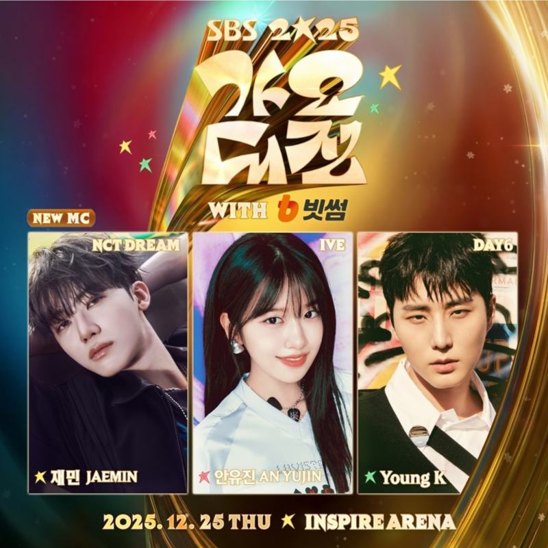 ⓒSBS[스포츠한국김현희기자]데이식스영케이,아이브안유진,엔시티드림재민이'2025SBS가요대전'MC로호흡을맞춘다.17일SBS는오는12월25일인천인스파이어아레나에서개최되는'2025SBS가요대전with빗썸'(이하'SBS가요대전')의세MC로영케이,안유진,재민이확정됐다고밝혔다.각각밴드,걸그룹,보이그룹의멤버인세사람은세대와팬덤의경계를허물고모두를하나로잇는글로벌K-POP조합으로기대를모은다.라디오DJ경험이있는영케이는차분하면서도깊이있는진행으로세MC의중심을잡아줄예정이다.2022년부터4년연속'가요대전'MC로활약중인안유진은생방송진행에능숙함은물론밝은에너지까지전하며독보적인존재로활약할전망이다.여기에센스와4차원매력을두루가진재민이합류해MC라인업을완성했다.'2025SBS가요대전'은'골든루프'(GoldenLoop)를주제로,찬란하게빛난2025년K-POP의여정을돌아보며다가올내일에도무한히확장하며더욱밝게빛날여정을이어간다는의미를담아진행된다.1차라인업으로는스트레이키즈,투모로우바이투게더,엔하이픈,아이브,르세라핌,보이넥스트도어,제로베이스원,라이즈,엔시티위시,베이비몬스터,올데이프로젝트등이이름을올렸다.2차라인업으로엔시티드림,더보이즈,에이티즈,있지,트레저,엔믹스,앤팀,투어스,아일릿,하츠투하츠,키키,코르티스등이합류했다.스포츠한국김현희기자[email protected]©스포츠한국.무단전재및재배포금지.
