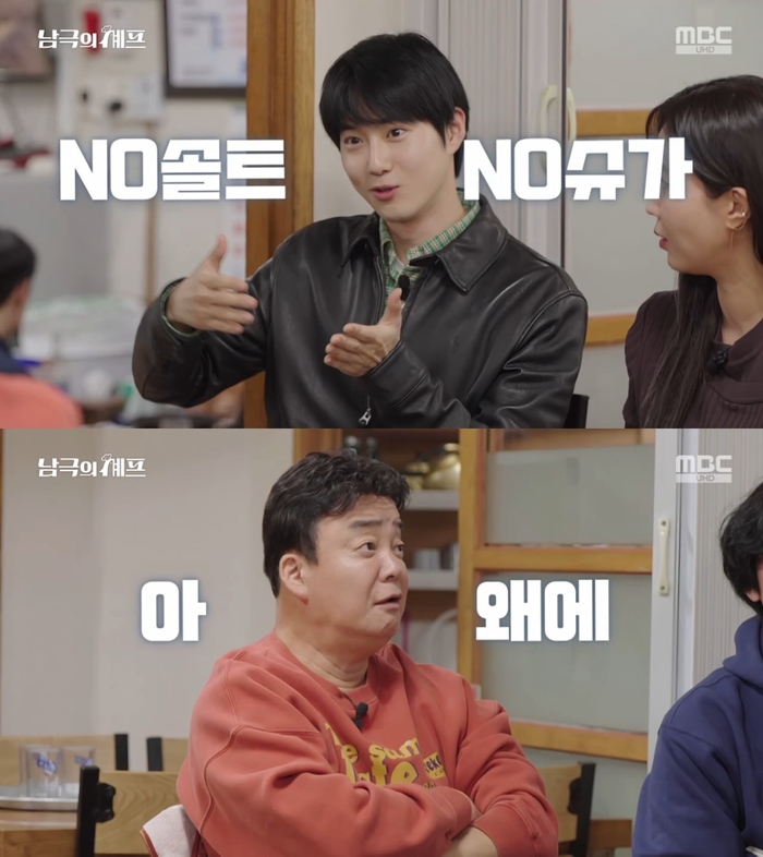 ‘남극의셰프’.사진IMBC‘남극의셰프’방송캡처요리연구가겸기업인백종원이그룹엑소수호의고백에당황했다.17일방송된MBC‘남극의셰프’에서는남극으로떠나기전한자리에모인백종원,임수향,수호,채종협의모습이그려졌다.이날백종원,임수향,수호,채종협은남극으로떠나기전해상안전훈련,소방안전훈련,육상안전훈련등을받아눈길을끌었다.훈련종료후저녁식사를하던중백종원은“남극은채소가귀하다고하더라.식재료가거의냉동이라고한다”며걱정을표했다.이후백종원은임수향,수호,채종협에게제일자신있는음식을물었다.수호가“내가혀가예민하다.평소에나트륨을거의안먹는다.NO솔트,NO슈가로산다”고고백하자백종원은“아왜”라며당황스러워했다.채종협역시“나도평소에슴슴하게먹는다”고털어놓자백종원은“차라리북극갈때가는게어떠냐.남극은아닌것같다”며심란해해웃음을자아냈다.한편‘남극의셰프’는매주월요일오후10시50분방송된다.[이세빈스타투데이객원기자]Copyright©스타투데이.무단전재,재배포및AI학습이용금지
