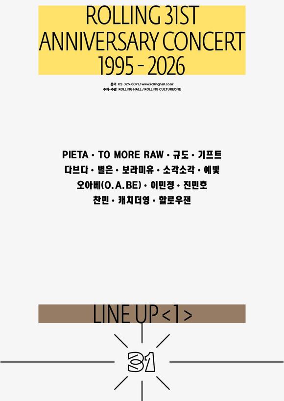 보라미유,예빛,진민호,기프트등15팀1차라인업발표2026년1월부터5월까지진행'롤링홀31주년기념공연'이2026년1월부터5월까지약5개월동안진행된다./롤링홀[더팩트ㅣ최현정기자]라이브클럽롤링홀이개관31주년을맞아특별공연을개최한다.롤링홀은27일"'롤링홀31주년기념공연'이2026년1월부터5월까지약5개월동안진행된다.1차라인업으로보라미유,예빛,진민호,기프트등총15팀이합류했다"고밝혔다.'롤링홀31주년기념공연'은힙합,발라드,R&B등장르의경계를넘나드는다채로운라인업과함께매달새로운주제와콘셉트로진행된다.1차라인업에는보라미유,예빛,진민호,규도,기프트,별은,소각소각,오아베,이민정,찬민,캐치더영,투모로우,피에타,할로우잰×다브다까지총15팀이이름을올렸다.롤링홀김천성대표는"1995년개관이후31년동안변함없는사랑을보내주신아티스트와관객여러분께깊이감사드리며앞으로도관객과아티스트,스태프모두가함께성장하고꿈꿀수있는건강한공연문화를만들어가겠다"고밝혔다.한편'롤링홀31주년기념공연'의자세한내용은롤링홀공식홈페이지와소셜미디어에서확인할수있다[email protected][연예부|[email protected]]발로뛰는더팩트는24시간여러분의제보를기다립니다.▶카카오톡:'더팩트제보'검색▶이메일:[email protected]▶뉴스홈페이지:http://talk.tf.co.kr/bbs/report/writeCopyright©더팩트.무단전재및재배포금지.
