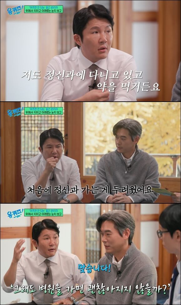[SBS연예뉴스|강선애기자]방송인조세호가정신과치료를받고있다고고백했다.지난26일방송된tvN'유퀴즈온더블럭'(이하'유퀴즈')에는정신건강의학과전문의이경준씨가게스트로출연했다.다양한기업이많은판교에서정신건강의학과를운영하는그는직장인상담을많이한다며"하루50~60명정도진료보고있다"고말했다.그는성취지향적환경에서치열하게일하는직장인들이주로느끼는힘든감정은'통제될수없는불안감'이라고설명했다.이경준전문의는"객관적으로봤을땐불안하지않아도되는상황인데,개인적인요인이나사소한것들이누적되다보면사람이느끼는불안의수준이병리적인수준으로높아지기도한다.불안으로인해통제되지않은생각들도생기고신체반응도온다.그순간까지오면본인이왜불안한지판단이되지않는다.어떤식으로길을찾아나가야할지판단이힘들어진다"라고덧붙였다.특히그는회사에서'부장'을달고있는중년들은보통자신의우울감을인정하지않는다고설명했다.그는"부장님들이오시면,있는대로얘기를잘안한다.실제로마음이힘들고고통받고아픈상태일수있는데,내가아프다는것과아프면안된다는게혼재돼있다.공황증상이나갑작스러운불안증상이와서진료를보면,실제로중등도이상의우울증상을겪는분들이많은데,여쭤보면본인은전혀우울하지않다고한다.제가듣기엔,우울하지않다는게아니라,'난우울하면안되는사람'으로들린다.우울증을인정하면지금까지의삶이실패이고물거품이돼버리는거같아서,본인이겪는실제고통보다많이줄여서얘기하는경향이있다"라고말했다.이에MC유재석은"우울증은감기같은거라고생각하면된다더라"며누구나겪을수있는증상이라했다.그러자조세호는"나는그냥말씀을드린다.나도정신과에다니고있고약을먹는다"라고고백했다.이어조세호는"나도처음엔(정신과에)가기두려웠다.그래도병원에가면괜찮아지지않을까싶었다.그래서더건강하게시간을보낼수있지않을까싶었다"라며용기를낸배경을설명했다.[사진=tvN방송캡처]강선애기자[email protected]©CopyrightⓒSBS.Allrightsreserved.무단전재,재배포및AI학습이용금지