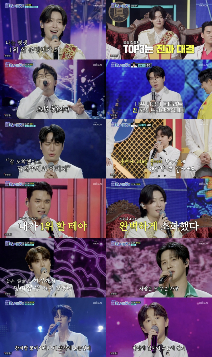 ‘사랑의콜센타’왕좌전쟁최고4.5%(사진=TV조선)'사랑의콜센타-세븐스타즈'김용빈이왕좌를사수하기위한전쟁에돌입했다.11월27일방송된TVCHOSUN'사랑의콜센타-세븐스타즈'(이하'사콜세븐')는'또다시쓰는미스터트롯3'특집으로꾸며졌다.진(眞)김용빈의왕관을노리는'미스터트롯3'TOP9멤버들이한치양보없는노래대결을펼친가운데,이들은서로의무대를직접평가하며매라운드색다른재미를선사했다.이날방송은닐슨코리아전국기준4.1%시청률을기록했다.지상파·종편·케이블포함동시간대전채널1위,목요예능전체1위에해당하는수치다.순간최고시청률4.5%까지치솟으며,뜨거운관심속에목요일밤안방을또한번사로잡았다.김용빈은앞선순위전에서모든멤버를제치고왕관을지켜낸주인공.이날오프닝에서는이미자의'내삶의이유있음은'으로자축무대를펼치며,'진'다운위엄을자랑했다.이를본멤버들은"역시진은다르다"라며기죽은듯한모습을보였지만,정작김용빈은"한번했으면됐지,왜이걸또하냐?"라며부담감을숨기지못했다.9명의도전자가운데1라운드를통해선정된TOP3만이김용빈과맞대결을펼칠수있어,긴장감과기대감을동시에높였다.1라운드최종1위는900점만점에서단5점이모자란점수를기록한춘길에게돌아갔다.이날춘길은이승재의'눈동자'로트롯풍발라드를완벽히소화했고,특히고음에서거칠게터지는보이스로야성미넘치는무대를선보이며"왜이곡을경연때안불렀는지의문이다.형에게딱맞춘노래다"라는찬사를이끌어냈다.멤버들은그의점수를인정하면서도자신들의무대에는줄곧최저점을줬던춘길에게집단야유를보내며웃음을자아냈다.이에춘길은"나쁜사람이되더라도진에도전하겠다"라며굴하지않는포부를드러내분위기를뜨겁게달궜다.눈물의사부곡을선보인강훈이TOP2에올랐다.지난4월갑작스러운부친상을겪은강훈은아버지에대한그리움을담아장민호의'내이름아시죠'를열창했다.무대도중오열하며진심어린감정을쏟아냈고,김용빈은"오늘노래에는진짜한이우러났다"라며최고점인100점을선사했다.한편강훈은"경연끝나고가장바쁠시기임에도TOP7멤버들이모두빈소에와줬다.마음써준덕분에잘버텼다.이자리를빌려고맙다고말하고싶었다"라며멤버들에게감사의마음을전해훈훈함을더했다.지난순위전에서김용빈에1점차로패하며아쉽게왕좌를놓쳤던미(美)천록담이최종TOP3에오르며또한번김용빈과맞붙을기회를얻었다.김용빈이대결전부터가장견제되는상대로천록담을지목했던만큼,기대감도높았다.이날천록담은박상철의'바보같지만'을안정감있게소화해감탄을자아냈고,이를본김용빈은"이제는형이트롯을완벽하게알고계신다는느낌이든다.더는본인을소개할때'신인가수'라는수식어를붙이지않아도될것같다"라며극찬했다.TOP3외에도출연진모두쟁쟁한무대를펼치며근소한점수차로희비가엇갈렸다.선(善)손빈아는조항조의'사나이눈물'로칼을빼들었지만,음정불안지적을받으며882점을기록했다.덜익은고기를줘김용빈을배탈나게했다는의혹의주인공추혁진은섹시한보이스가돋보이는선곡으로TOP3문턱까지올랐으나아쉽게고배를마셨다.다비치의'모르시나요'를부른박지후는"본인한테정말잘어울리는곡을가져왔다.영악하다"라는호평과"장르가아쉽다"라는엇갈린반응을동시에받으며탈락의아쉬움을남겼다.앞선순위전에서인턴사원중유일하게타이틀매치에올랐던유지우는모두의기대를안고무대에섰다.이날나훈아의'사모'를선곡해무대를펼쳤지만,결과는879점으로다소아쉬운기록에그쳤다.예상보다낮은점수에유지우가잠시충격받은표정을보이자멤버들도눈치를살폈지만,곧"노래로만정확히심사하겠다"라며의젓한태도를보이며흐뭇함을자아냈다.한편,이날방송말미에는최종진의자리를두고펼쳐질김용빈과TOP3의타이틀매치가예고돼기대감을고조시켰다.김용빈이또한번왕좌를사수할지,아니면그자리가바뀌게될지호기심을자극한다.운명의대결을앞둔TVCHOSUN'사랑의콜센타-세븐스타즈'는매주목요일밤10시방송된다.박지혜기자[email protected]뉴스연예팀기사제보[email protected]©bnt뉴스.무단전재,재배포및AI데이터활용금지