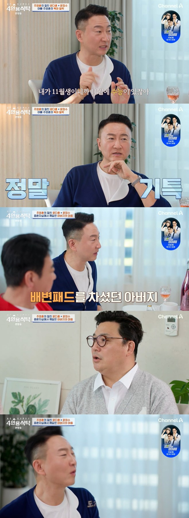 ▲출처|채널A'절친토큐멘터리-4인용식탁'캡처[스포티비뉴스=최신애기자]윤정수가2세계획을전했다.1일방송된채널A'절친토큐멘터리-4인용식탁'에는주영훈과절친윤다훈,윤정수가출연했다.지난11월30일원자현과결혼식을올린윤정수는이날2세에대한질문을받았다.이에그는"2세가걱정이다.아내가받는스트레스도많을것같다"고밝혔다.그러면서도윤정수는"그런데아내가(날짜를계산해서)'오늘일찍들어와'이런식으로말을한다"고덧붙여웃음을안겼다.이에윤다훈은"나는새벽에약수물을떠가기도했다.우리아내도실은임신하려병원을다녔다.하지만서로스트레스받지말자고하면서(시술을)멈췄는데아이가생겼다.딸은지금고3이다"라고윤정수를토닥였다.<저작권자ⓒSPOTVNEWS.무단전재및재배포금지>Copyright©스포티비뉴스.무단전재및재배포금지.
