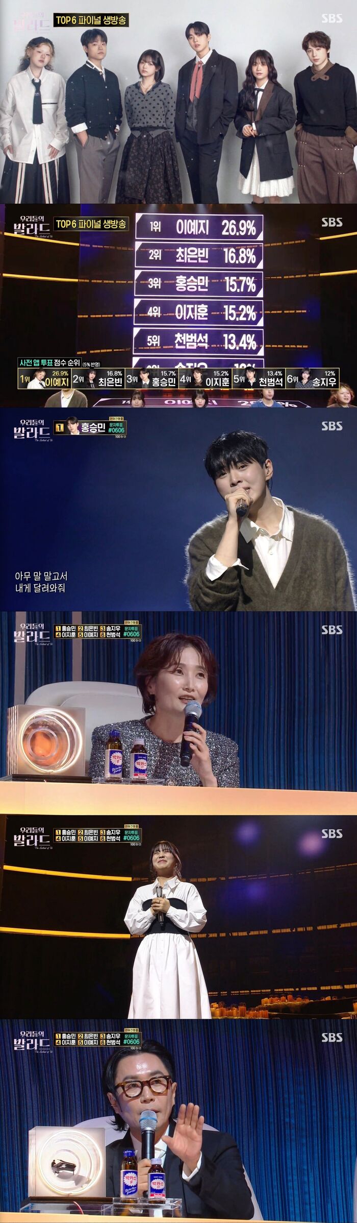 [SBS연예뉴스|김효정에디터]사전투표순위1위는?2일방송된SBS'우리들의발라드'에서는우리들의발라드초대우승자를선정하는파이널라운드가펼쳐졌다.이날본격적인경연에앞서사전앱투표결과가공개됐다.전체점수에서5%점수를차지하는사진투표에서1위는이예지가차지했다.이어최은빈,홍승민,이지훈,천범석,송지우가차례대로득표를해눈길을끌었다.이에전현무는"문자투표비중이크기때문에일희일비하긴이르다"라며문자투표를독려했다.이날경연이첫번째주자는홍승민.지난세미파이널에서감동의무대를선보였던그는정준일의안아줘를선곡해열창했다.박경림은홍승민에대해"처음순서라긴장되고떨릴텐데잘불렀다"라며"홍승민이라는참가자는이별을노래하는DNA를가진것같다.특히홍승민의이별은정말잘됐으면좋겠고좋은사람만났으면좋겠고하는따뜻한이별을노래한다.곡선곡도좋았고좋은결과가있었으면좋겠다.이별은발라드,발라드는홍승민"이라고박수를보냈다.이어차태현은"지난경연에서윤상님께서홍승민에대해대형발라더가나왔다고하셨는데너무동의할수밖에없는무대였다.점점발전하는모습을보는데제아들도아닌데굉장히기특하다"라며감격했다.그리고크러쉬는"완성형보컬이되어가는과정을함께해서영광이다.홍승민의호흡들은드라마를만들고그래서듣는이의심장을때린다"라고극찬했다.이어진무대는최은빈이장식했다.그는신승훈의나보다조금더높은곳에니가있을뿐을선곡해무대를선보였다.최은빈의무대에만점을준크러쉬는"듣는내내소름이돋았다.자기호흡을가지고노래하는모습이처음부터끝까지영화를보는듯한느낌을받았다"라고극찬했다.그리고정재형은"오늘무대들도누구도몇점차이로누가이길거라고판단하지않을것같다.6명이나만의발라드를부르고있다"라며"여태까지은빈이가지고있던감성을이번에는어떻게새롭게보여줄수있을까고민했을거같은데오늘그걸보여줬다.오늘무대를보면서이친구가녹음을하면이런소리를내겠구나하는느낌이들었다"라고평가했다.Copyright©CopyrightⓒSBS.Allrightsreserved.무단전재,재배포및AI학습이용금지