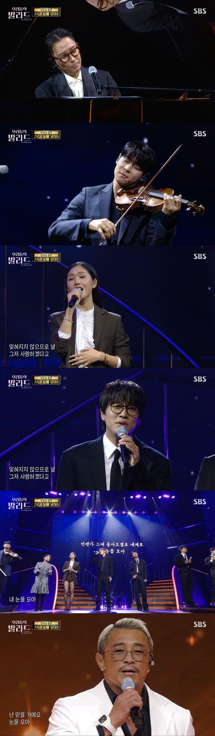 [SBS연예뉴스|김효정에디터]탑백귀대표들이축하무대를선보였다.2일방송된SBS'우리들의발라드'에서는우리들의발라드초대우승자를선정하는파이널라운드가펼쳐졌다.이날본격적인경연에앞서탑백귀대표들의오프닝공연이공개됐다.정재형의피아노,대니구의바이올린연주에추성훈,차태현,박경림,크러쉬,정승환,미미모두가함께'내눈물모아'를노래한것.특히수많은경연대회의MC를맡았던전현무도함께노래하며끝까지탑백귀대표단석에앉아눈길을끌었다.이날차태현은"세대를넘어함께공감해주시고어린친구들의목소리와감성을사랑해주셔서감사하다는말씀드리고싶어"라며탑백귀를대표했다.그리고이곡을만든정재형은"다른의미보다참가자들이섰던무대에서우리가함께노래했다는게이방송의취지에맞지않나싶다.함께부른다는것에의미가있다"라고소감을전했다.Copyright©CopyrightⓒSBS.Allrightsreserved.무단전재,재배포및AI학습이용금지