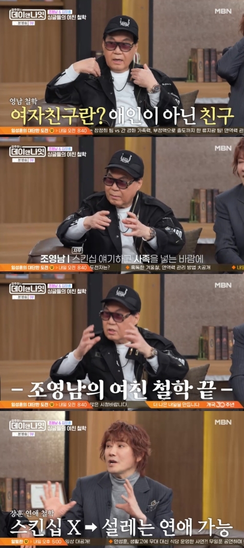‘김주하의데이앤나잇’사진|MBN조영남이여자친구가많다는말을방송에서계속하는이유를밝혔다.6일오후방송된MBN‘김주하의데이앤나잇’에는화려한싱글인조영남과김장훈이게스트로출연했다.이날방송에서조영남은여자친구가많은비결이스킨십을하지않는거라고했다.김장훈은“나도같은의견이다”라며하기도.조영남이“스킨십시도하려고한적없다.플라토닉이다”라고하자김주하는“선이확실하게있으시네”라며의외라는표정으로쳐다봤다.또김주하가“방송에서여자친구얘기를하면반응이좋지않은데계속하는이유가뭐냐”고묻자조영남은“정의,올바름이다.모두를위해서다.자꾸스킨십넣고사족을하는바람에그단어가이상해진거다.진짜여자친구다”라고답했다.이에김장훈은“이걸나이가들어야아는것같다.스킨십을안하면계속설레는연애가가능하다.나도스킨십10년넘은것같다”고동의했다.‘김주하의데이앤나잇’은토요일오후9시40분방송된다.[서예지스타투데이객원기자]Copyright©스타투데이.무단전재,재배포및AI학습이용금지