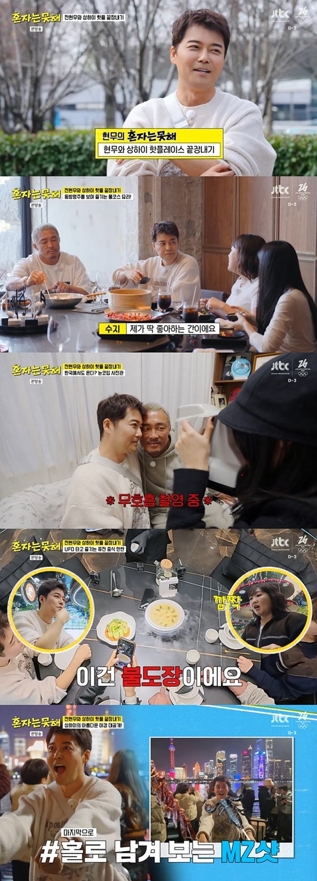 티브이데일리포토[티브이데일리김진석기자]전현무,추성훈,이수지,이세희가'MZ성지'상하이를100%즐겼다.지난3일방송된JTBC예능프로그램'혼자는못해'에서는'트민남'전현무를따라추성훈,이수지,이세희가여행지인중국상하이를방문해멋과낭만이가득한핫플레이스를정복하며유쾌한케미스트리를뽐냈다.상하이투어를준비한전현무는여행유경험자로서자연스럽게멤버들을리드하며뇌섹남면모를보여줬다.과거와현재,미래를한눈에볼수있는푸둥과와이탄풍경에홀린멤버들은쉴새없이카메라셔터를누르며추억을남겼다.상하이풍경을감상한멤버들은옛모습을간직하고있는한식당을찾았다.예술가이자승려인홍일법사의가르침을바탕으로한식당곳곳에는홍일법사가남긴작품들이있어시선을사로잡았다.음악과미술을테마로한독특한요리들은침샘을자극했다.식사전후로흥을돋우는음악공연이멤버들을감탄케했다.이수지의반전피아노연주부터등려군의대표곡을부르는라이브공연까지펼쳐진것.세대를불문한명곡의등장에흥이끓어오른전현무는노래실력을발휘해가수와화음을맞추며특별한하모니를선사했다.분위기에취한멤버들이향한곳은상하이의핫플레이스가모두모여있는난징동루였다.거리에서내내"나는스타다"를외치는이수지의자기PR이이어지는동안추성훈을알아본중국시민도등장해놀라움을안겼다.추성훈의즉석팬미팅이끝난이후멤버들은길거리음식을맛볼수있는푸드코트로향했다.벌레를좋아한다는막내이세희는독특한비주얼의전갈과메뚜기꼬치를즐기며범상치않은식욕을자랑했다.상하이식만두인셩젠바오와소롱포로배를채운멤버들은색다른콘셉트의눈코입사진관에도착했다.티격태격하던'추무듀오'추성훈과전현무는얼굴을가까이맞대고서로의눈을함께기록하는등끈끈한브로맨스로이수지와이세희를웃음짓게했다.출국시간이다가오자전현무는미래도시에온듯한분위기의식당으로멤버들을안내하며마지막까지알찬시간을선물했다.이세희는사진촬영욕구를불태웠고MZ감성충만한인증샷을여럿탄생시켰다.비행기시간에맞춰멤버들을떠나보낸뒤홀로남겨진전현무는상하이투어의피날레인야경감상에나섰다.푸둥과와이탄의화려한풍경은탄성을유발했다.아름다운조명을보며멤버들을떠올린전현무는추성훈,이수지,이세희에게보낼인증샷촬영을끝으로여행을매듭지었다.한편'혼자는못해'는'2026밀라노코르티나동계올림픽'중계로10일,17일휴방하며다가오는24일방송되는5회부터매주화요일저녁8시50분에방송된다.[티브이데일리김진석기자[email protected]/사진=JTBC'혼자는못해']혼자는못해[Copyrightⓒ*세계속에新한류를*연예전문온라인미디어티브이데일리(www.tvdaily.co.kr)/무단전재및재배포금지]Copyright©티브이데일리.무단전재및재배포금지.