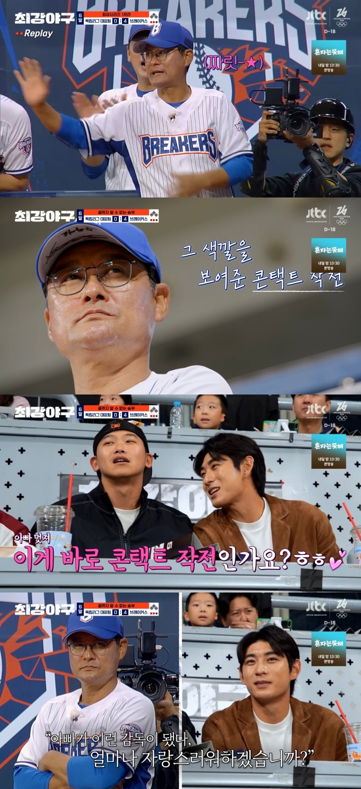 (MHN김설기자)'바람의아들'이종범감독의신들린지략과'무등산아기호랑이'윤석민의완벽한부활이고척돔을뜨겁게달궜다.19일방송된JTBC예능프로그램'최강야구'134회에서는브레이커스와독립리그대표팀의'최강시리즈'1차전이공개됐다.이날이종범감독은첫직관경기를맞아일명'작두범'모드를가동하며치밀한승부수를띄웠다.이감독은타석에들어서는선수들을특유의신호로불러세워상황별맞춤작전을주문했다.특히모자챙과허리띠를활용한복잡한사인은물론,대주자투입시선보인국민체조연상동작등쉴새없는작전지시로그라운드에긴장감을불어넣었다.관중석에서이를지켜보던아들이정후는친구들에게"저게바로콘택트작전"이라며아버지의야구를직접해설해훈훈한웃음을자아냈다.이감독의예능감넘치는입담도빛났다.김태균의수비동작을본뒤"태균이점프가서운하다.저정도인줄알았으면(키큰)서장훈을세웠을것"이라고농담을던져덕아웃을웃음바다로만들었다.한편,이날경기에서는투수윤석민이은퇴식이후무려4년4개월27일(1610일)만에직관경기마운드에올라관객들을뭉클하게했다.관중석에는윤석민과붕어빵인두아들과미모의아내가포착되어눈길을끌었다.윤석민은"우리아들들은아빠가세계최고의투수인줄안다.그기대에부응하고싶다"며각오를다졌다.팬들의뜨거운함성속에마운드에선윤석민은전매특허인슬라이더부터직구,팜볼까지자신의필살구종을모두꺼내들며상대타자들을압도했다.그는"팬들의외침은내게야구를하는가장큰의미이자자부심"이라며감동적인소감을전했다.한편'최강야구'는매주월요일밤10시30분에방송된다.사진=JTBC'최강야구'방송화면Copyright©MHN.무단전재및재배포금지.
