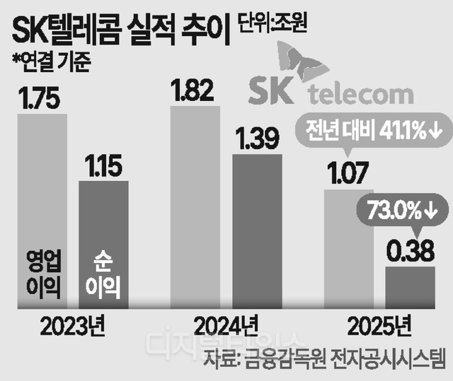 작년영업이익전년대비41%감소MNO부진에도AI사업성장세지속지난해사이버침해사고여파로실적이악화한SK텔레콤이올해질적성장기반을다지는데주력한다.인공지능(AI)과통신경쟁력을강화해장기적성장을위한구조를만들겠다는방침이다.SK텔레콤은연결기준2025년매출과영업이익이각각17조992억원,영업이익8118억원으로잠정집계됐다고5일공시했다.이는전년대비각각4.7%,41.1%감소한수치다.자회사매각과사이버침해사고로인한가입자감소,요금감면등을포함한책임과약속프로그램시행등이매출감소에영향을미쳤다.영업이익역시매출감소영향과유심교체등사이버침해사고관련비용,연말사업재정비과정에서발생한비용등이반영됐다.당기순이익은같은기간전년대비73.0%줄어든3751억원을기록했다.사이버침해사고관련개인정보보호위원회과징금납부등이영향을미쳤다.SK텔레콤은올해업(業)의본질을‘고객가치혁신’을최우선에두고기본과원칙을바탕으로경쟁력을강화하는한편수익성중심의단단한내실을다져질적성장의기틀을닦아나갈예정이다.특히상품과마케팅,네트워크,유통채널등기존통신모든영역에AI를도입해고객경험을제고할계획이다.더나아가AI전환(AX)가속화를바탕으로올해무선사업수익성을회복하는데집중하는한편본원적경쟁력을강화해중장기성장을위한구조적기반을확보에주력한다.SK텔레콤은실적악화에따라지난해3분기에이어4분기에도2개분기연속현금배당을하지않기로했다.이에따라작년배당금은주당총1660원으로결정됐다.박종석최고재무책임자(CFO)는이날콘퍼런스콜에서“재무적영향이컸고조직재정비과정에서비용이발생하며연간배당축소가불가피했다”며“올해는실적정상화를통해배당수준을회복할수있도록최선을다하고,비과세배당등주주가치제고를위한방안도함께검토하겠다”고말했다.2025년매출가운데통신사업매출은9조9460억원으로전년대비6.8%줄었다.해킹여파로무선가입자가감소한데다8월요금의50%를할인하는등고객감사패키지를시행한영향이다.핸드셋가입자수는2175만명으로전년(2273만명)대비4.3%감소했다.올해무선매출전망에대해배병찬이동통신(MNO)지원실장은“고객감소영향이연간으로확장되면서침해사고이전매출수준을회복을기대하기에는녹록지않은환경”이라며“올해MNO는무엇보다수익성강화에집중할계획”이라고말했다.인공지능데이터센터(AIDC)관련매출은5199억원으로전년대비34.9%증가했다.서울가산과경기양주데이터센터의가동률이오르고판교데이터센터인수등이매출성장에기여했다.지난달정부의‘독자AI파운데이션모델’프로젝트2단계진출에성공한초거대AI모델A.XK1을통해서는향후기업·소비자간거래(B2C)와B2B모두에서사업기회를모색할방침이다.박CFO는“AI사업은작년새로운성장동력의기반을다지는데집중했다면올해부터는잘할수있는영역을중심으로선택과집중해실질적성과를만들어갈계획”이라고설명했다.이혜선기자[email protected]©디지털타임스.무단전재및재배포금지.