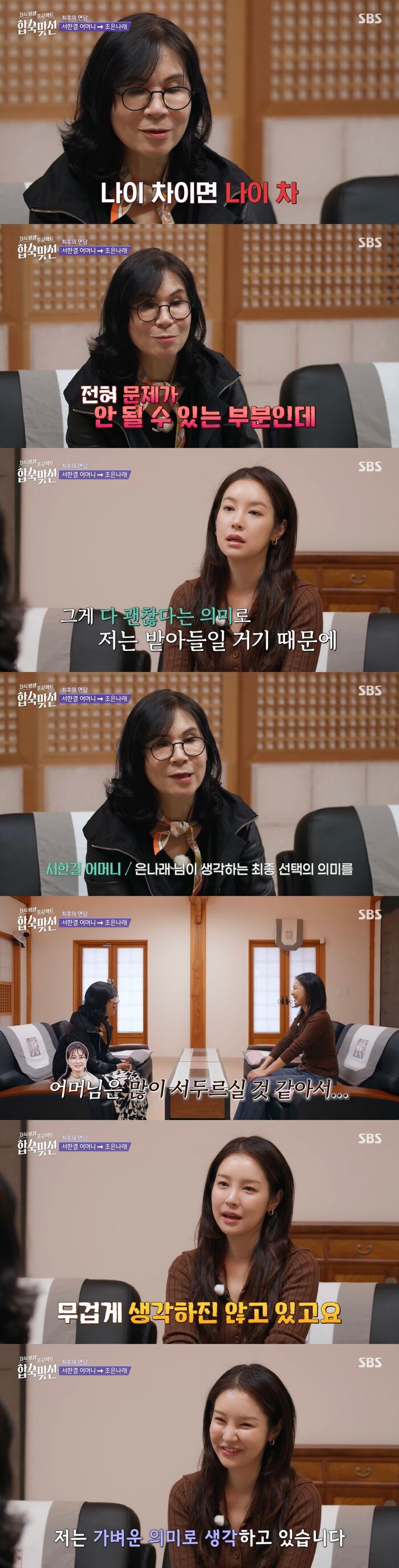 [SBS연예뉴스|김효정에디터]조은나래가서한결어머니와마지막면담을가졌다.5일방송된SBS'자식방생프로젝트합숙맞선'(이하'합숙맞선')에서는최종선택의날이밝았다.자녀들의선택후양가어머니가찬성해야만최종커플이성사되는방식의최종선택을앞두고어머니들에게마지막대화기회가주어졌다.이에서한결의어머니는조은나래와대화를했다.그는"밖에서연애를하면이런기회를못가지잖아.나도이런기회가주어져서너무감사하다"라고말문을열었다.이어서한결의어머니는"너무예쁘고그런데내가칭찬을많이못해줘서미안하네"라며지난시간들을돌아보았다.그리고조은나래와진솔한대화를이어갔다.서한결의어머니는"마음을떠나서나이차가걱정된다.사실한결이형이다섯살차이인데다른사람이면문제가안되는데한결이라문제"라고말했다.이에조은나래는"당연히그럴수있다고생각한다.입장을바꿔도똑같을것같다"라며"그래도선택을하게된다면그게다괜찮다는의미로받아들일것같다"라고말했다.이어서한결의어머니는조은나래에게최종선택의의미가어떤것인지물었다.그는"어머님은많이서두를수도있겠다싶다"라며조은나래는어떤지물었다.이에조은나래는"저는그렇게까지무겁게생각하지않고있다.더알아가보는정도의가벼운의미로느껴진다"라며"우려되는것도실제로수용가능한것인지경험을해봐야느낄수있을것같다"라고말해눈길을끌었다.Copyright©CopyrightⓒSBS.Allrightsreserved.무단전재,재배포및AI학습이용금지