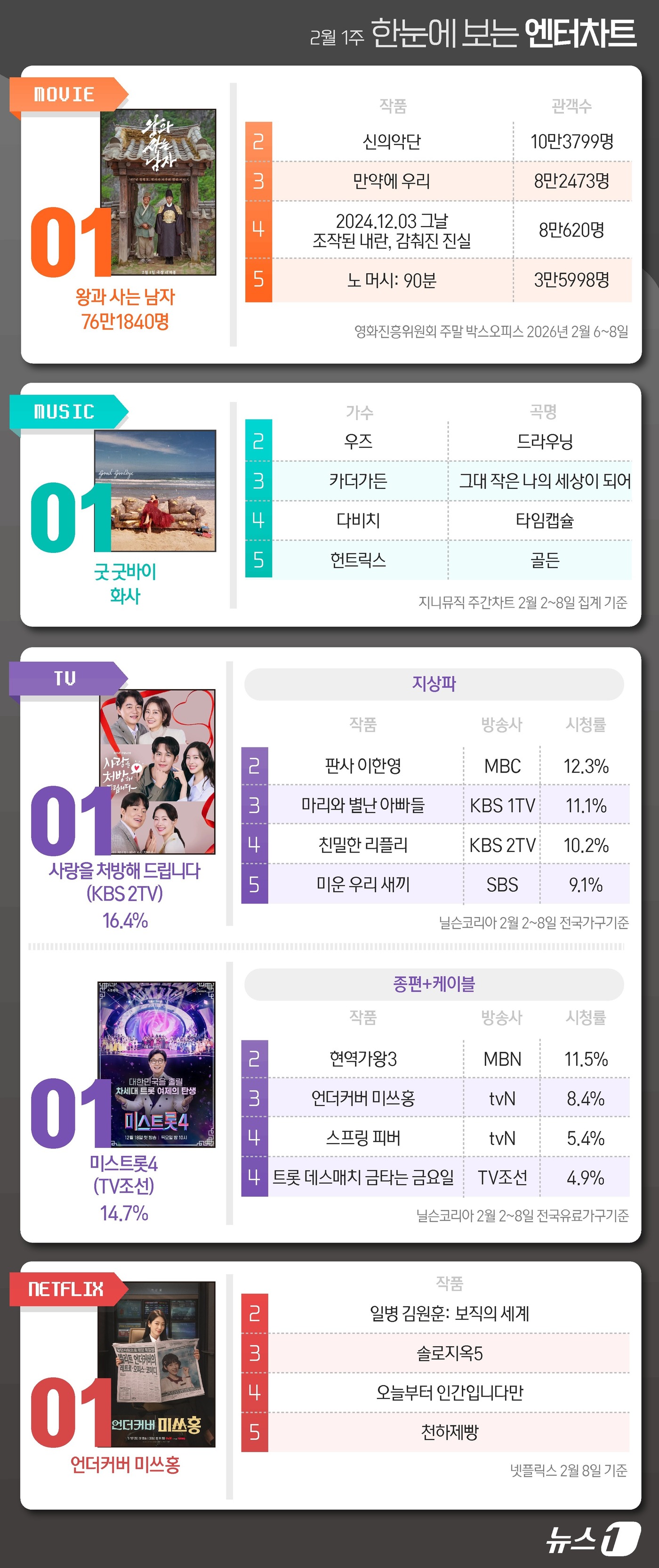 2026년2월첫째주ⓒ뉴스1김초희디자이너(서울=뉴스1)안태현기자◇영화='왕과사는남자'1위(영화진흥위원회영화관입장권통합전산망2026년2월6~8일)2월첫째주주말박스오피스1위는유해진박지훈주연의영화'왕과사는남자'가차지했다.지난4일개봉한'왕과사는남자'는이달6일부터8일까지주말3일간76만1832명의관객을동원했으며,누적관객수는100만1101명으로나타났다.2위는박시후정진운주연의'신의악단'으로같은기간10만3782명의관객과만났다.누적관객수는111만5896명이다.3위는구교환문가영주연의'만약에우리'로8만2473명이관람했다.누적관객수는248만4417명이다.다큐멘터리영화'2024.12.03그날조작된내란,감춰진진실'은8만616명으로4위,할리우드영화'노머시:90분'은3만5998명으로5위에각각올랐다.두영화의누적관객수는각각12만484명과6만849명이다.◇음원=화사'굿굿바이'1위(지니뮤직주간차트2026년2월2~8일)2월첫째주음원부문1위도화사의'굿굿바이'였다.이로써이곡은11주연속정상의자리를지켰다.우즈의'드라우닝'은2위를기록하며식지않는인기를과시했다.최근티빙오리지널예능'환승연애4'에삽입되면서역주행흐름을타고있는카더가든의'그대작은나의세상이되어'는3위에올라눈길을끌었다.다비치의'타임캡슐'은4위,넷플릭스인기애니메이션'케이팝데몬헌터스'속가상걸그룹헌트릭스가부른OST'골든'은5위에각각자리했다.랭크됐다.◇지상파=KBS2TV'사랑을처방해드립니다'1위(닐슨코리아2026년2월2~8일전국가구기준)KBS2TV주말드라마'사랑을처방해드립니다'는16.4%로지상파주간시청률1위에오르며,2주연속정상을꿰찼다.'사랑을처방해드립니다'는30년동안악연으로얽혔던두집안이오해를풀고서로의상처를보듬으며,결국하나의가족으로다시태어나는패밀리메이크업드라마로진세연박기웅이주연으로나섰다.2위는MBC금토드라마'판사이한영'으로12.3%의시청률을보였다.KBS1TV일일드라마'마리와별난아빠들'은11.1%로3위,KBS2TV일일드라마'친밀한리플리'는10.2%로4위를각각거머쥐었다.SBS예능프로그램'미운우리새끼'는9.1%를나타내며5위로집계됐다.◇종편+케이블=TV조선'미스트롯4'1위(닐슨코리아2026년2월2~8일전국유료가구기준)종합편성채널및케이블채널부문에서는TV조선(TVCHOSUN)예능'미스트롯4'가14.7%로종편,케이블합산시청률순위1위에올랐다.MBN예능'현역가왕3'는11.5%로2위에오르며음악예능들의강세를엿볼수있게했다.3위에는8.4%의시청률을보인박신혜고경표주연의tvN토일드라마'언더커버미쓰홍'이명함을내밀었다.안보현이주빈이주연으로나선tvN월화드라마'스프링피버'는5.4%로4위,TV조선예능'불타는금요일'은4.9%로5위를각각거머쥐었다.◇OTT='언더커버미쓰홍'1위(넷플릭스2026년2월8일기준)넷플릭스TV부문에서는tvN드라마'언더커버미쓰홍'이1위를품에안았다.2위는넷플릭스일일예능인'일병김원훈:보직의세계',3위는넷플릭스예능'솔로지옥5'가각각차지했다.김혜윤로몬주연의SBS금토드라마'오늘부터인간입니다만'은4위,MBN의K-베이커리서바이벌'천하제빵'은5위에각각오르며인기를뽐냈다[email protected]©뉴스1.Allrightsreserved.무단전재및재배포,AI학습이용금지.