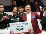 -PBA팀리그5라운드최종일서NH농협카드에2:4敗-스롱피아비,5R11승2패AVG1.406'상금100만원'-리더엄상필"SK렌터카,하나카드잡았다…무서운팀없어"[SPORTALKOREA]오상진기자= PBA팀리그우리금융캐피탈이7연승을질주하며5라운드우승을자축했다.우리금융캐피탈은11일경기도고양시고양킨텍스PBA스타디움에서열린'웰컴저축은행PBA팀리그2025-2026'5라운드최종일서NH농협카드를상대로세트스코어1:4로패배했다.지난10일휴온스를꺾고5라운드우승을조기에확정한우리금융캐피탈은최종전을패배했지만,7승2패(승점22)로2위하이원리조트(8승1패·승점20)를제쳤다.2024-25시즌창단한우리금융캐피탈첫라운드우승을차지하며두시즌연속포스트시즌진출을확정했다.우리금융캐피탈은NH농협카드전와최종전에서'캄보디아특급'스롱피아비를출전엔트리에서제외하고경기에나섰다.1세트다비드사파타(스페인)-엄상필이'스페인듀오'안토니오몬테스-이반마요르에2:11(3이닝)로패배했고,2세트에도서한솔-김민영이정수빈-황민지에0:9(6이닝)로완패하며세트스코어0:2로밀렸다.끌려가던우리금융캐피탈은3세트사파타가마민껌(베트남)을15:4(4이닝)로꺾어반격의발판을마련했다.하지만우리금융캐피탈은기세를이어가지못한채4세트강민구-김민영이조재호-김보미에2:9(4이닝)로,5세트에선지훈이조재호에9:11(6이닝)로지면서세트스코어1:4패배를당했다.경기는패배했지만우리금융캐피탈리더엄상필은공식기자회견에서"팀창단후처음으로라운드우승을했다.아직포스트시즌이남아있지만,라운드우승이처음이라매우기쁘다"며"5라운드에서SK렌터카와하나카드를상대로시즌첫승을거뒀다.이제포스트시즌에무서운팀은없다.최선을다해우승까지도전해보겠다"고포부를전했다.5라운드MVP(상금100만원)는스롱이수상했다.스롱은5라운드에서11승2패(단식5승,복식6승2패)애버리지1.406을기록하며팀의5라운드우승을견인했다.스롱은"제가MVP를받았지만,진짜MVP는팀원들이다.팀원들이잘해줘서내가받을수있었다"고공을돌렸다.한편정규리그종합2위는최종일에결정됐다.종합3위였던웰컴저축은행이이날세트스코어4:2로이긴반면,종합2위였던하나카드는하이원리조트에1:4로패배했다.두팀은이날결과로27승19패·승점79로승점과승수에서동률을이뤘지만세트득실률에서웰컴저축은행이1.183으로1.145의하나카드를제치고2위로올라섰다.2위로올라선웰컴저축은행은플레이오프에직행했으며,3위하나카드는준플레이오프로내려갔다.PBA팀리그정규리그가마무리된가운데,오는13일부터'고양킨텍스PBA스타디움'에서포스트시즌이펼쳐진다.PBA팀리그포스트시즌은5개라운드에서우승을차지한팀들이진출하며,포스트시즌은13일4위우리금융캐피탈과5위크라운해태의와일드카드전(2전2선승제)로시작된다.와일드카드전은4위우리금융캐피탈에게1승어드밴티지가주어진다.이후14일과15일에는와일드카드전의승자와정규리그3위간의준플레이오프(3전2선승제)가진행되며,준플레이오프승자는16일부터정규리그2위웰컴저축은행과플레이오프(5전3선승제)를치른다.플레이오프승자는18일부터정규리그1위파이널(7전4선승제)을통해우승트로피의주인을가른다.만일플레이오프경기가조기종료될경우,파이널일정이하루앞당겨져17일부터펼쳐진다.사진=PBA제공제휴문의[email protected]