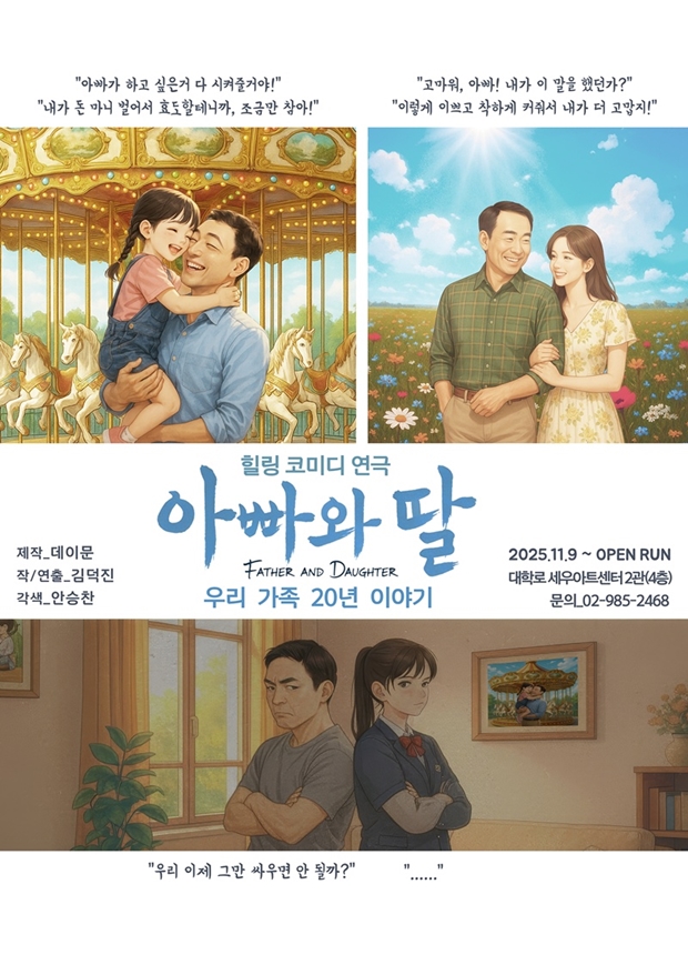 연극아빠와딸포스터[티브이데일리한서율기자]서툰표현속에서도서로에진심인부녀관계.'아빠의딸'은가족이라는소재를통해세대를아우른감동의순간을선사한다.지난해11월9일개막한연극'아빠와딸'(연출김덕진)은20년간함께한부녀가속마음을꺼내게되는순간을그린다.이는모든가정에서일어날법한갈등과화해의과정을담은메시지로소중한존재와가족관계를돌아보는시간을마련한작품이다.'아빠와딸'은아빠와딸,두사람의시점을통해같은상황속서로다르게남겨진감정과기억을보여준다.1막에서는아빠의하루가,2막에서는딸의시선으로흘러간다.동일한무대위배우들의다른행동과분위기를통해각자의입장을설득력있게그려낸다.작품은가족관계속뗄수없는죄책감과사랑을녹여냈다.가장가까운사이이기에진학,취업,결혼과같은현실적인고민을나누면서도사소한말투와표현하나로다툴수밖에없는복잡다단한관계를보여주며관객들의웃음보와눈시울을동시에자극한다.'아빠의딸'은관객들의경험을투영하게만들며80분간진행되는극의몰입도를높였다.특히아빠진식역의김덕진,안승찬과딸유림을연기하는고민지,송현진등이현실적인부녀관계를그리며작품을풍성하게채운다.'아빠와딸'은매주토요일,일요일오후1시20분서울시종로구세우아트센터2관에서공연하며예매는놀티켓,네이버등주요티켓예매처에서가능하다.[티브이데일리한서율기자[email protected]/사진제공=해오름ENT]아빠와딸[Copyrightⓒ*세계속에新한류를*연예전문온라인미디어티브이데일리(www.tvdaily.co.kr)/무단전재및재배포금지]Copyright©티브이데일리.무단전재및재배포금지.