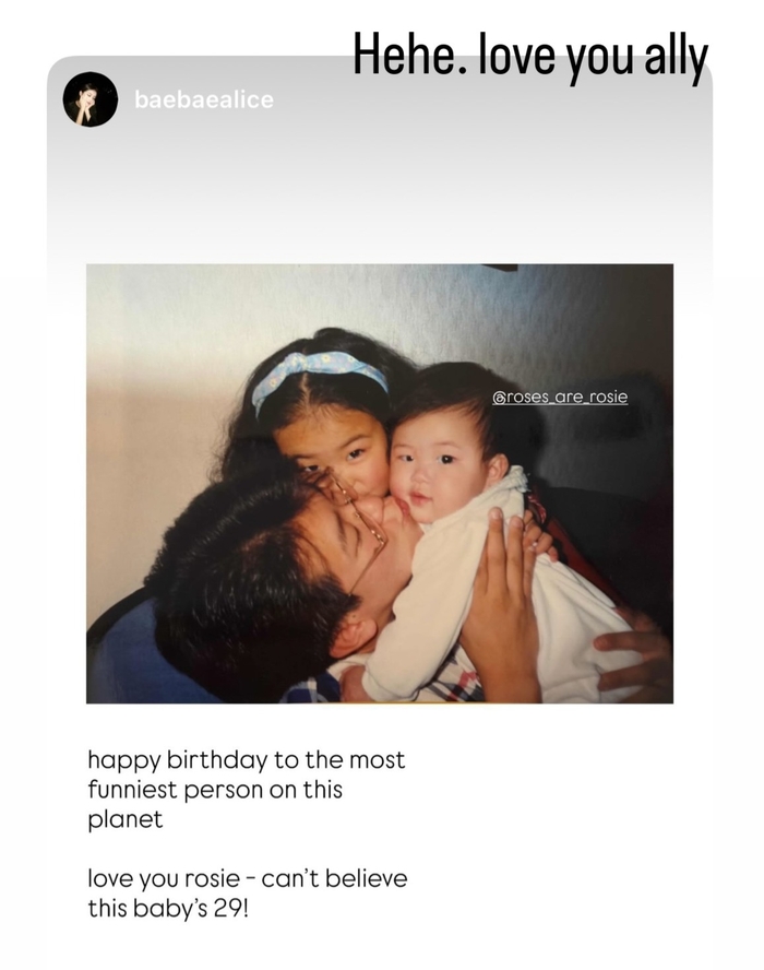로제SNS.[스포츠서울|박진업기자]블랙핑크멤버로제가29번째생일을기념해사랑스러운어린시절모습을공유했다.로제는11일자신의사회관계망서비스(SNS)를통해친언니앨리스박이게시한과거사진과축하메시지를올렸다.공개된사진에는갓난아기시절의로제가가족들의품에안겨사랑을듬뿍받는모습이담겨팬들의미소를자아냈다.블랙핑크SNS.언니앨리스박은해당게시물에“지구상에서가장재미있는사람의생일을축하해.사랑해로지.이아기가벌써29살이라니믿기지않아”라는영어메시지를남기며동생을향한각별한애정을표현했다.이에로제는“언니사랑해”라고화답하며자매간의훈훈한우애를드러냈다.로제의생일을맞아전세계팬들은축하메시지를쏟아내며뜨거운반응을보이고있다.한편,로제의친언니앨리스박은변호사로한국에서도외국법자문사로활동하고있다[email protected]©스포츠서울.무단전재및재배포금지.