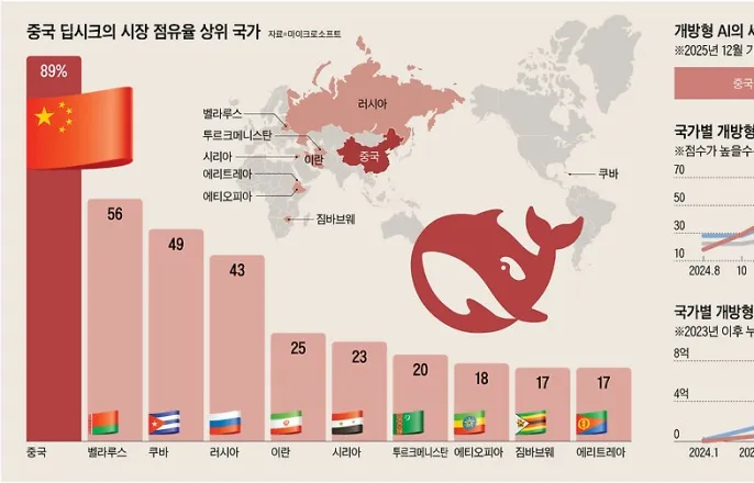 [‘딥시크쇼크’1년]<下>개발도상국시장휩쓸어아프리카우간다정부는작년10월‘해바라기’라는이름의자체인공지능(AI)모델을출시했다.우간다정부와비영리단체(선버드AI)가중국알리바바의개방형(오픈소스)AI모델인큐원(Qwen)-3을기반으로만들었다.40개넘는언어를쓰는우간다는이AI로디지털격차를없애고,농민이지역토착어로농업지도를받게한다는계획이다.2025년1월‘딥시크쇼크’이후1년동안중국AI의거침없는확산은세계AI지형을남북으로양분하는결과를가져왔다.자본과인프라가풍부한선진국인글로벌노스(GlobalNorth)는미국의고성능폐쇄형모델(챗GPT)을쓰지만,비용에민감한남미·아프리카같은글로벌사우스(GlobalSouth)는중국의고효율무료모델(딥시크·큐원)을표준으로채택했다.미국과중국의정치·경제헤게모니싸움이AI에도고스란히적용되며‘AI디바이드’‘AI블록화’현상이가속화하고있다.안준모고려대교수는“중국은미국에대항해자신들의AI를세계표준으로만들려한다”며“중국의‘일대일로(一帶一路)’정책의확장판인‘AI일대일로’양상을띠고있다”고말했다.그래픽=박상훈◇중국,개방형AI에서미국제쳐개방형AI인오픈소스는폐쇄형과달리AI개발설계도를무료로공개한다.가격이점뿐아니라전세계개발자들이함께오류를수정하며빠르게성능을향상시킬수있다.자금과인력을들여개발해놓고누구나쓸수있게공개하면기업입장에서손해일수있다.하지만중국은막대한자금력과칩기술을바탕으로앞서가는미국의AI패권에맞서기위해오픈소스방식을택했고,이를통해AI영토를넓혀가고있다.미국이GPU(그래픽처리장치)수출을통제하며중국을고립시키려했지만,중국은소프트웨어최적화로반격에성공하며저개발국가의AI인프라를장악해가는것이다.MS는최근보고서에서“글로벌사우스(남미·아프리카·동남아)의AI트래픽중60%이상이중국계오픈소스AI모델에기반을두고있다”고했다.허깅페이스에따르면중국의개방형AI모델다운로드는2024년1월100만건에서올해1월8억1800만건으로급증했다.미국의개방형모델은같은기간1100만건에서6억100만건으로증가하는데그쳐중국에뒤졌다.작년12월기준전세계개방형AI의62%가중국모델을기반으로하고있다.미국(32%)의2배정도다.중국의개방형모델은성능면에서도뒤지지않는다.아티피셜애널리시스에따르면전체AI모델중즈푸AI가개발한GLM-4.7(6위)과딥시크의V3.2(8위),문샷AI의키미K2씽킹(9위)등중국개방형AI가상위권에올랐다.◇‘AI판일대일로’노리는중국중국AI모델은빠르게저개발국가에침투하고있다.엔비디아의비싼AI칩없이도쓸수있도록설계돼AI인프라가부족한국가에사실상유일한선택지다.MS에따르면딥시크는벨라루스(56%),쿠바(49%),러시아(43%)에서절반안팎의시장점유율을차지했다.아프리카주요국가에서도17~18%다.벤처캐피털(VC)a16z는“여전히폐쇄형모델이70%로압도하지만중국개방형모델증가세가가파르다”며“중국은최대AI모델개발·수출국중하나로부상했다”고했다.중국은무료AI를통해저개발국가의데이터와기술주권을장악하고궁극적으로글로벌AI생태계주도권을가져가겠다는전략이다.딥시크는무료AI챗봇서비스를아프리카에제공하고,화웨이는딥시크서비스와자사클라우드를함께판매하는식이다.케냐나이로비에서AI스타트업을창업한시코기타우최고경영자(CEO)는“앤스로픽의클로드,구글의제미나이,메타의라마등을사용해봤지만,결국비용이문제였다”며“딥시크의저렴한가격은아프리카젊은사업가에게매력적이다”고했다.블룸버그는“고객확보,소프트파워구축,방대한데이터확보를위한중국의장기전략”이라고했다.리창중국총리는지난해7월세계AI콘퍼런스에서“전세계국가,특히개발도상국을돕기위해중국의기술을제공하겠다”고밝혔다.이는중국이저개발국가에항만·고속도로·공항등핵심인프라건설자금을지원해재정적으로의존하게만든뒤정치·경제적영향력을확대하려는일대일로전략과비슷하다.AI업계관계자는“중국AI에의존한국가들은데이터주권을잃게되고,편향된데이터로학습한중국AI모델이개발도상국의국가표준지식이될우려가있다”고지적했다.Copyright©조선일보.무단전재및재배포금지.