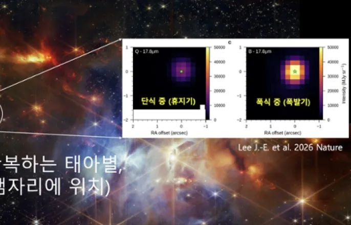 서울대이정은교수팀,별탄생과정서규산염생성·이동메커니즘첫규명국내연구진이태양계와행성이만들어지는초기단계의핵심과정을관측으로밝혀냈다.별이태어나는과정에서규산염이결정화되는순간과그물질이외곽으로이동하는메커니즘을제임스웹우주망원경(JWST)으로세계최초로포착한것이다.과학기술정보통신부는이정은서울대학교교수연구팀이별형성과정에서발생하는폭발적질량유입(accretionburst)이원시행성계원반안쪽을고온으로가열해규산염을결정화시키고,이렇게생성된물질이외곽으로운반될수있음을관측으로입증했다고22일밝혔다.이번연구는과기정통부기초연구사업(중견연구·기초연구실)지원으로수행됐다.제임스웹우주망원경으로관측한태아별EC53의중적외석분광스펙트럼(J.-E.Leeetal.2026,Nature).위그림은제임스웹우주망원경(JWST)중적외선분광기(MIRI)로관측한태아별EC53의스펙트럼.폭발기(빨간색)에는휴지기(파란색)대비밝기가3배이상증가하며,특히10μm부근에서규산염흡수특성이뚜렷하게나타난다.아래그림은폭발기와휴지기의밝기비율을비교한그래프로,10μm영역에서큰증가가확인된다.이는폭발단계동안원시행성계원반내부에서규산염성분이새롭게형성됐음을시사한다.이정은서울대학교물리천문학부교수제공규산염은지구형행성과혜성을구성하는핵심광물이다.특히결정질규산염은600℃이상의고온환경에서만형성되는것으로알려져있다.그럼에도극도로차가운태양계외곽에서기원한혜성에서결정질규산염이발견되면서,고온에서만들어진물질이어떻게외곽까지이동했는지는오랜미해결문제로남아있었다.연구팀은국내에서유일하게확보한제임스웹우주망원경관측시간을활용해뱀자리성운에위치한태아별EC53을집중관측했다.EC53은약18개월주기로밝기가변해휴지기와폭발기를명확히구분할수있는천체다.연구진은JWST의중적외선분광기(MIRI)를이용해두시기의스펙트럼을비교관측했다.자기유체역학적원반풍에의한규산염결정화및재분배모식도(J.-E.Leeetal.2026,Nature).폭발단계동안원시행성계원반에서일어나는규산염결정화와이동과정을도식화한그림이다.왼쪽은폭발기원반내부의온도분포와함께결정질휘석(연두)과감람석(초록)의결정화영역을보여주며,오른쪽은형성된결정질규산염이혼합돼이동하는과정을나타낸다.이들규산염은자기유체역학적원반풍(MHDdiskwind)에의해원반표면에서들어올려져외곽영역까지운반될수있으며,원반내부의수직혼합으로수년내중간면에서결정질규산염비율이증가함을시사한다.이정은서울대학교물리천문학부교수제공그결과폭발기에서만결정질규산염의특징적인적외선신호가뚜렷하게검출됐다.분석결과이는결정질감람석과휘석성분으로,태아별에가까운뜨거운원반안쪽에서새롭게형성된물질임이확인됐다.이는규산염결정화가별탄생초기의폭발적진화단계에서실제로일어남을보여주는직접적인관측증거다.연구진은또원반안쪽에서형성된결정질규산염이원반풍(diskwind)을통해차가운원반외곽으로운반될수있음을함께밝혀냈다.이는혜성속결정질규산염의기원과이동을하나의물리적시나리오로설명할수있음을의미한다.연구진사진.서울대학교제공이번연구성과는국제학술지Nature에"강착폭발이행성형성원반에서규산염을결정화시킨다(Accretionburstscrystallizesilicatesinaplanet-formingdisk)"라는제목으로21일(현지시간)게재됐다.연구를이끈이정은교수는"오랜기간축적해온이론적예측이제임스웹우주망원경관측으로검증된사례"라며"후속관측을통해규산염결정화와물질이동과정이다른별에서도보편적으로나타나는지확인해나갈계획"이라고말했다.이번성과는태양계뿐아니라다른항성주위의행성계형성과정이해에도중요한기준점을제시하며,제임스웹우주망원경을활용한시계열관측연구의새로운이정표로평가된다.김종화기자[email protected]©아시아경제.무단전재및재배포금지.