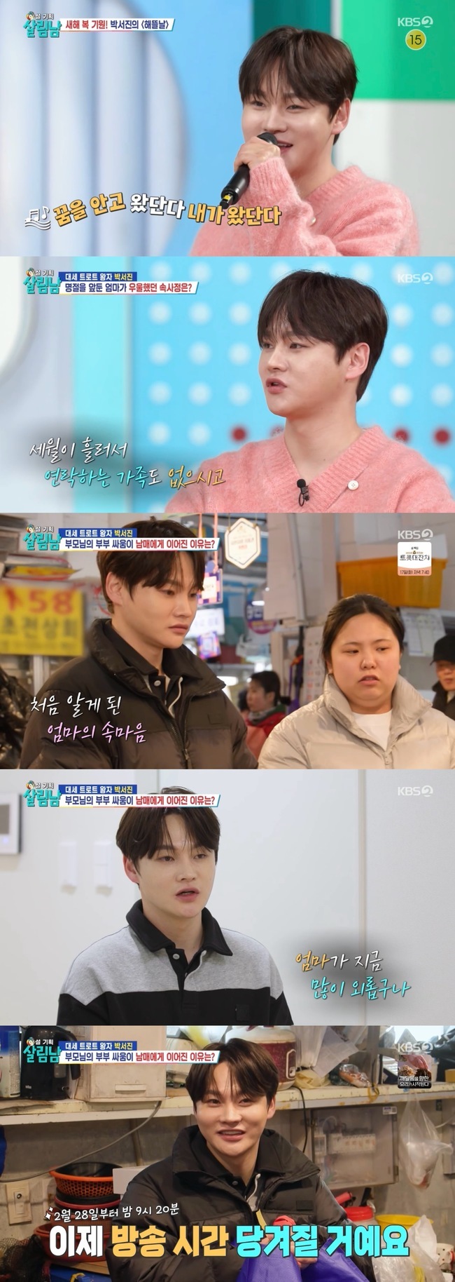 KBS2TV‘살림하는남자들시즌2’방송캡처[뉴스엔배효주기자]‘살림남’박서진이설날을앞두고진한공감대를형성했다.2월14일방송된KBS2TV‘살림하는남자들시즌2’(이하‘살림남’)는박서진의‘해뜰날’무대로경쾌하게포문을열었다.이어설날을앞둔박서진가족의현실공감에피소드가그려지며재미를선사했다.설날을앞두고박서진과동생효정은삼천포로향했다.그러나평소와달리방안에기운없이누워있는어머니의모습이포착되며분위기는단번에가라앉았다.걱정이깊어진박서진은일부러장난을걸어봤지만어머니의반응은무심했고,심지어아버지의잔소리까지더해지며갈등이시작됐다.결국어머니는자리를뜨며가족간의긴장감이한층고조됐다.이에어머니의기분을풀기위한가족들의노력이이어졌다.효정은특유의애교로어머니와함께했고,박서진과아버지는직접전을부치며분주히움직였다.알고보니어머니는명절이다가오자외동으로서느끼던외로움과쓸쓸함이깊어졌던상황.이를알지못한아버지는어머니에게차례준비를재촉하며잔소리를이어갔고,언성이높아지며서로의감정은더욱격해졌다.눈치를보던박서진남매는다툼의원인이됐던문어를직접사기위해시장으로향했다.제철이아니라문어를찾는게쉽지않은상황속에서도우연히문어를발견,분위기가풀리는듯했지만효정을통해어머니의외로움을알게된박서진은복잡한심경을드러냈다.속상함은동생에게향했고,남매의말다툼으로까지번졌다.이후우연히만난시장이모와의대화를통해박서진은어머니의마음을다시금돌아보게됐다.또한효정이좋아하는물메기까지사들고돌아오며다음이야기에대한기대를더했다.이날방송에서박서진은명절이라는익숙한풍경속에서가장현실적인가족의모습을보여줬다.갈등과이해를오가며가족의의미를다시짚어낸시간이었다.박서진은분위기가무거워질때마다특유의예능감으로흐름을환기했고,때로는솔직한속내를드러내며공감의폭을넓혔다.한편,설날풍경속에서드러난어머니의진심은다음주방송을통해이어질예정이다.박서진가족의명절이야기가어떻게마무리될지궁금증을남겼다.KBS2TV‘살림하는남자들시즌2’는매주토요일밤10시35분방송되며,28일부터는밤9시20분으로방송시간이변경될예정이다.뉴스엔배효주hyo@기사제보및보도자료[email protected]ⓒ뉴스엔.무단전재&재배포금지Copyright©뉴스엔.무단전재및재배포금지.